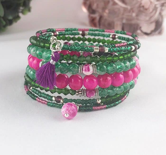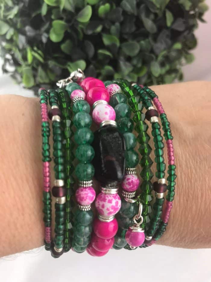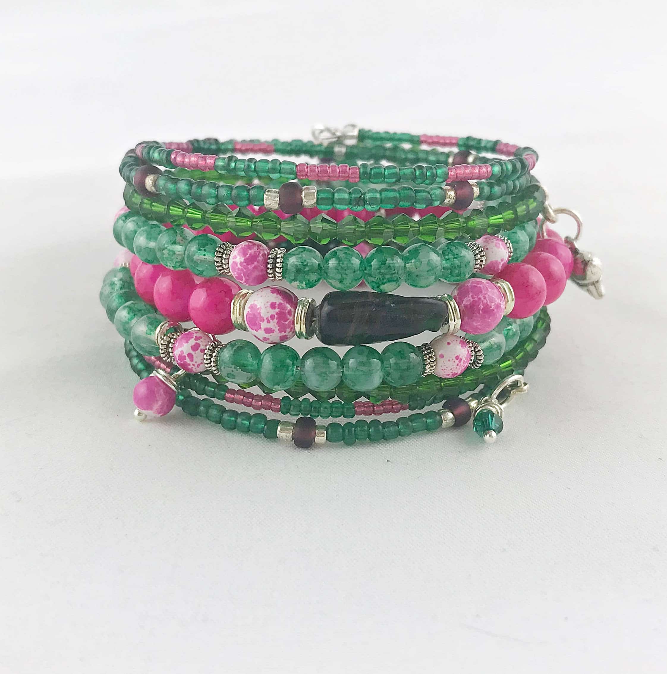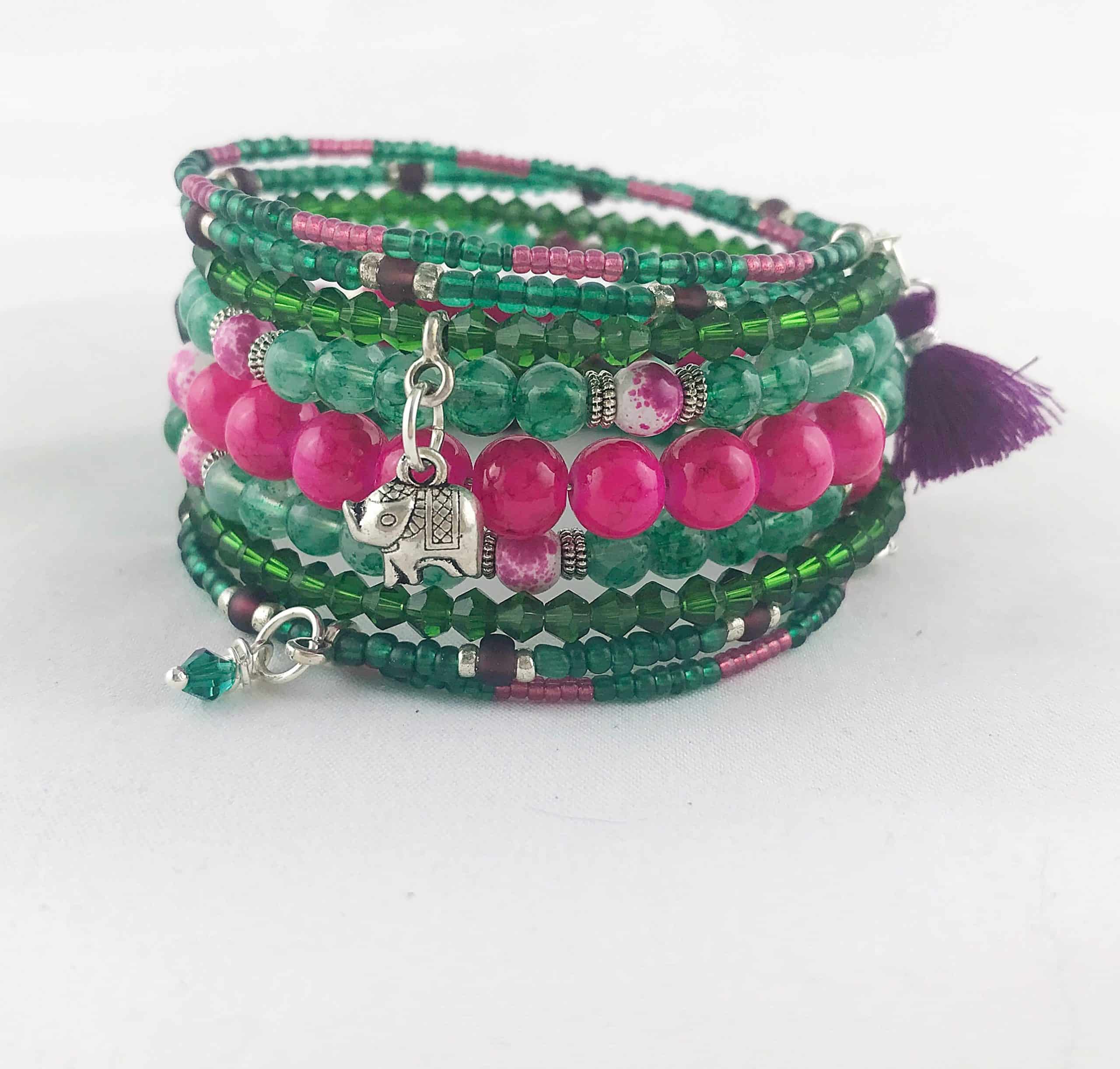Wickel Armreif mit Charms – Grüntöne & Pink im kontrastreichen Boho-Mix