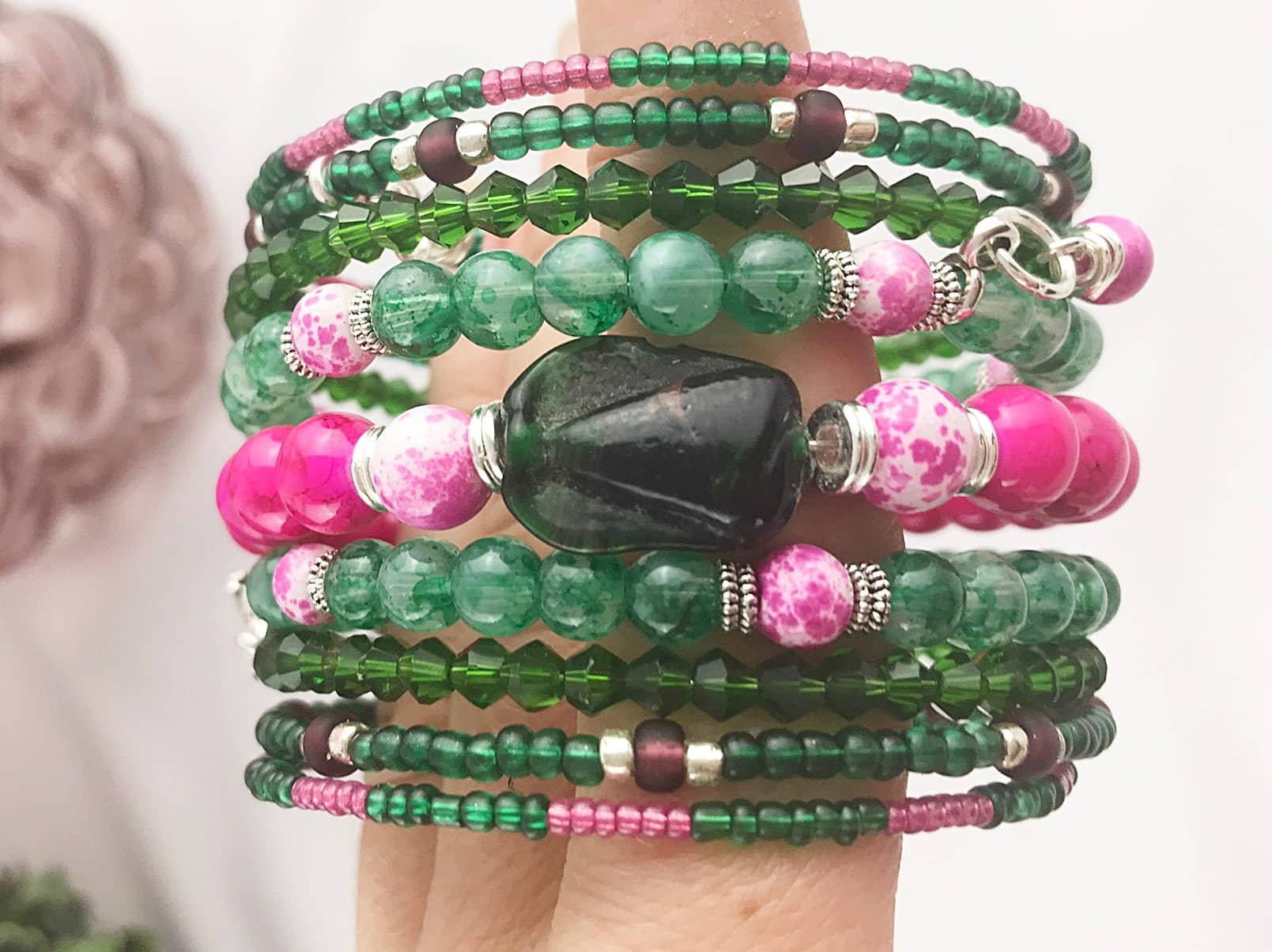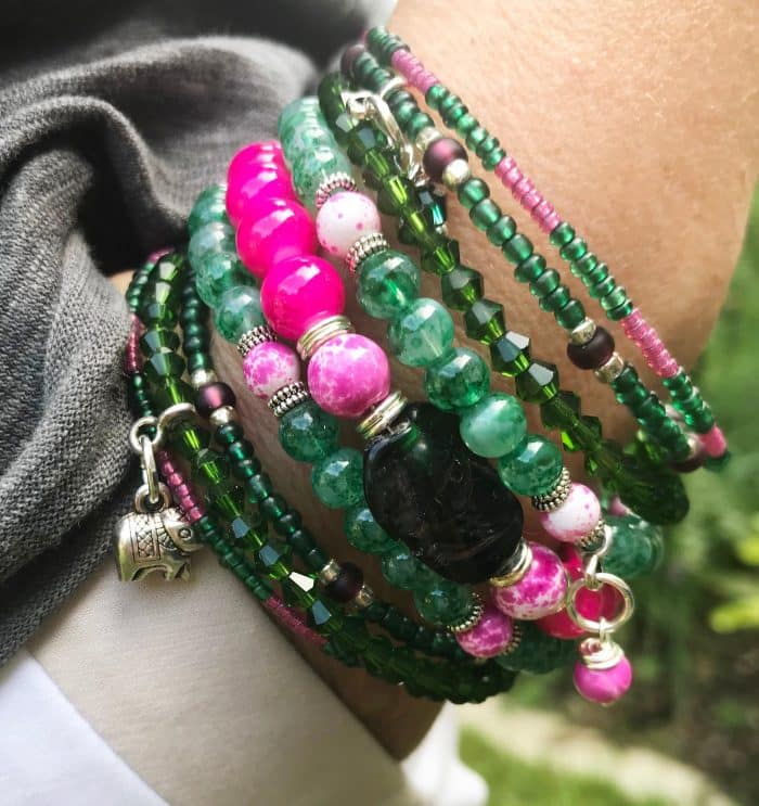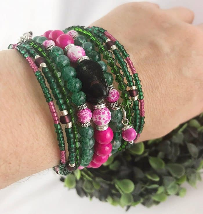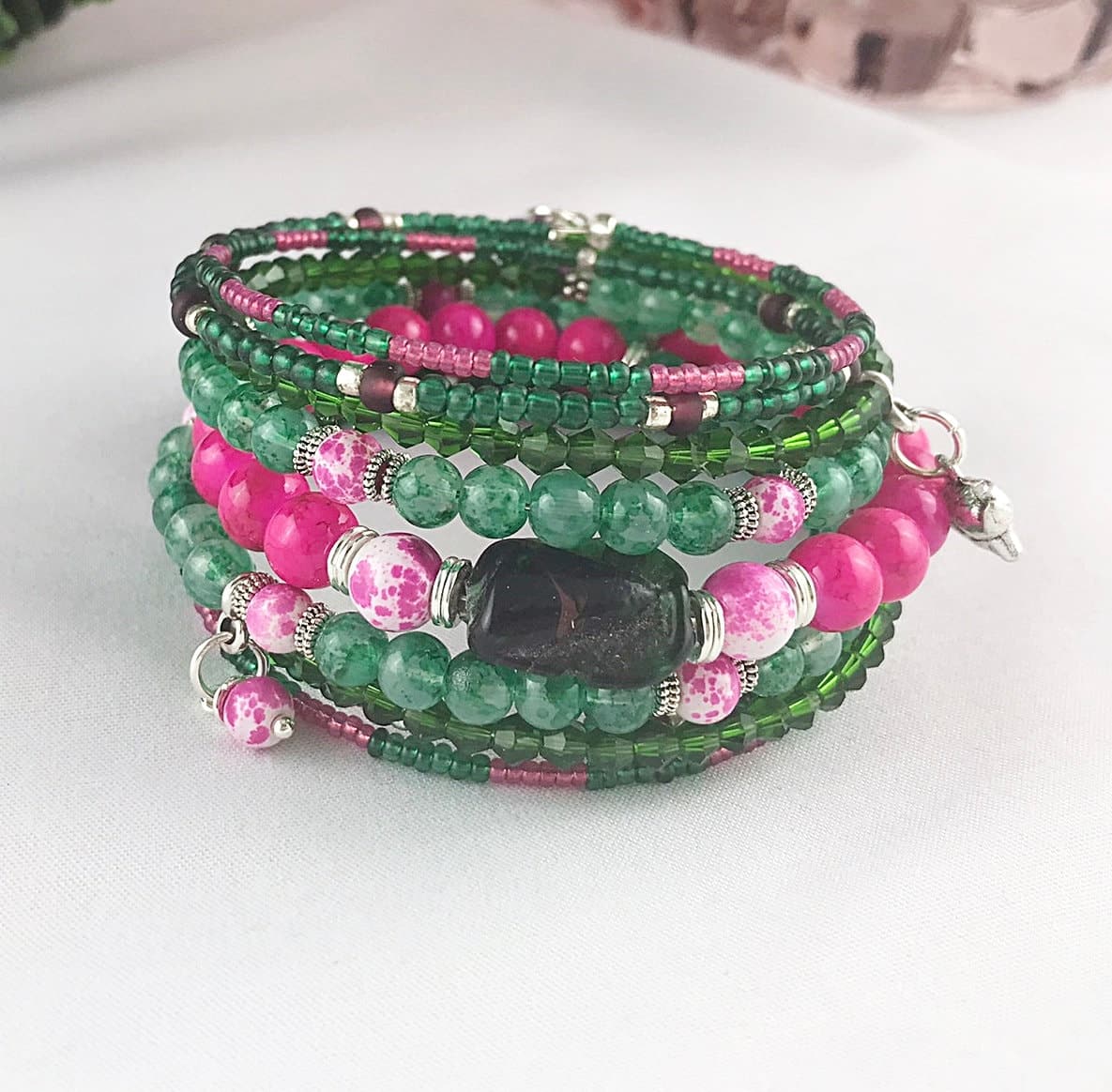 Wickel Armreif mit Charms – Grüntöne & Pink im kontrastreichen Boho-Mix