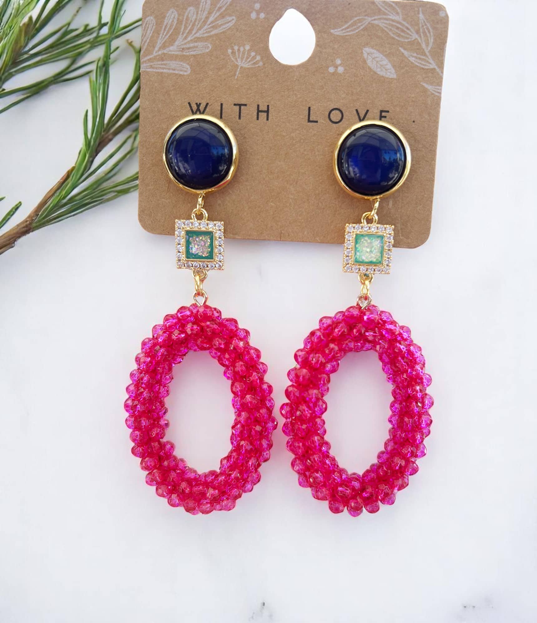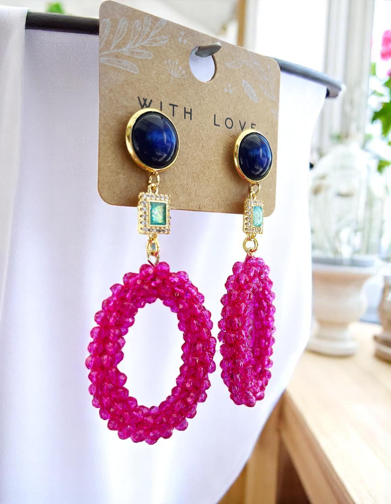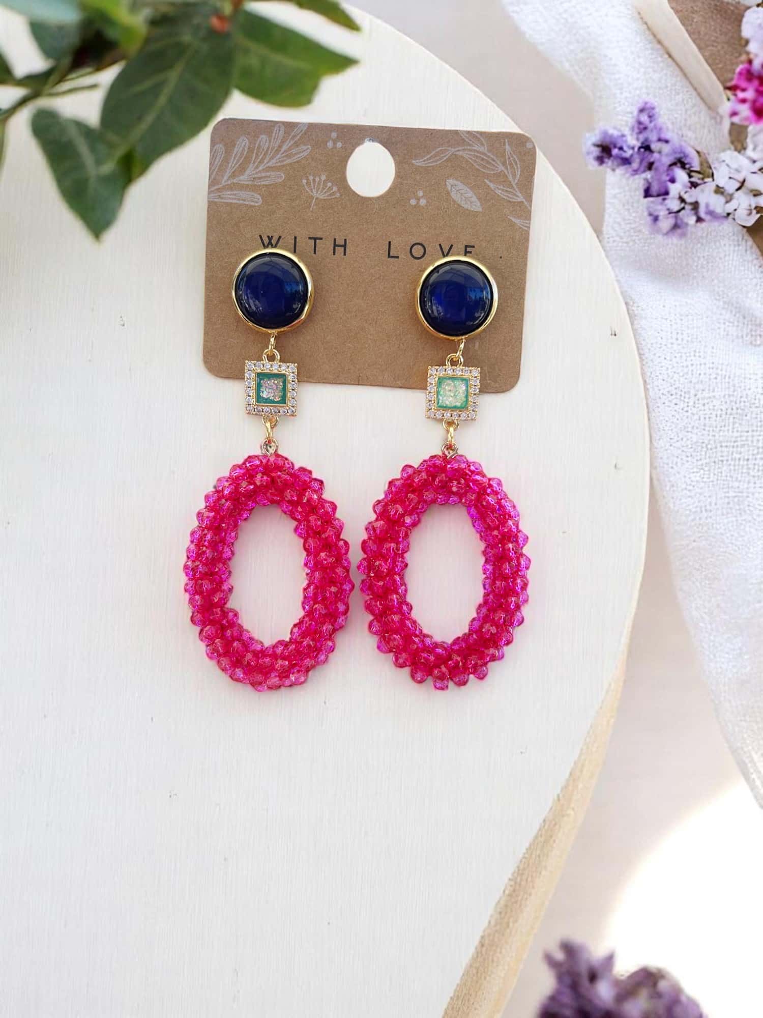 Die Ohrringe LULU sind ein echtes Statement für alle, die Schmuck mit Farbwirkung und Glanz lieben. Die Kombination aus kräftigem Magenta, tiefem Dunkelblau und glitzernden Akzenten in Türkis macht dieses Paar zu einem stilvollen Blickfang für besondere Anlässe oder einen farbintensiven Alltagslook.