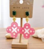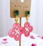 Schimmernde Ohrringe in kräftigem Pink mit vergoldeten Muschel-Details & grünen Kristallsteckern. Leicht, stilvoll & hochwertig – perfekt für besondere Anlässe.