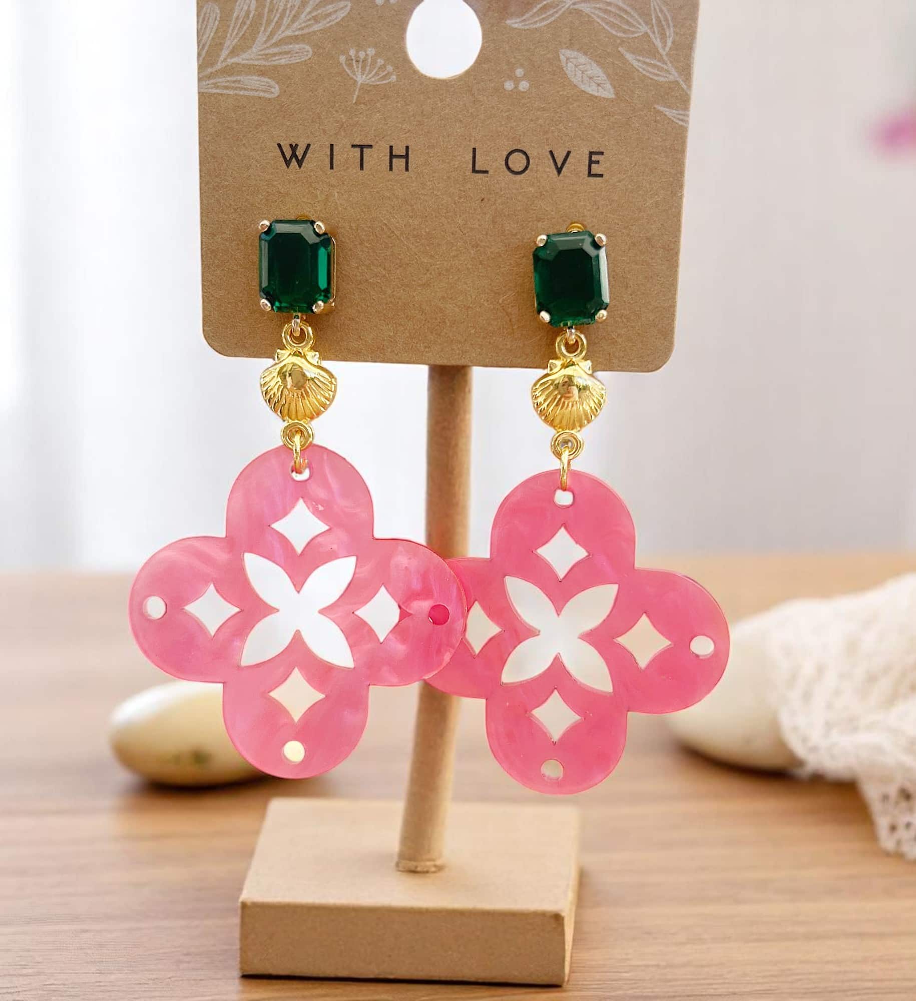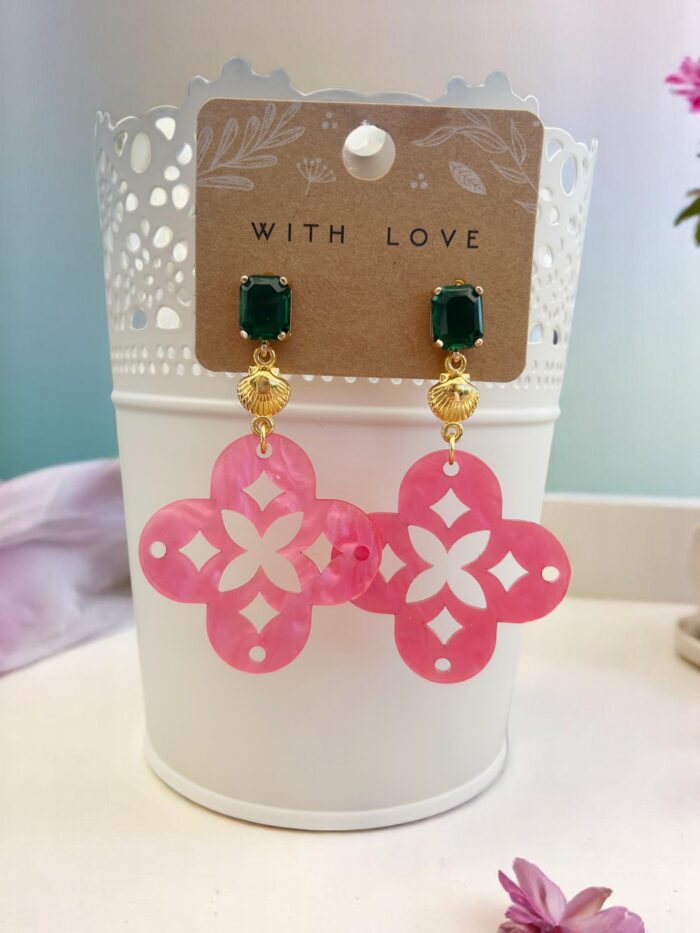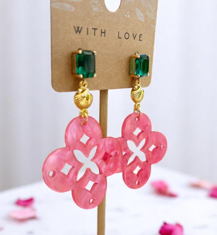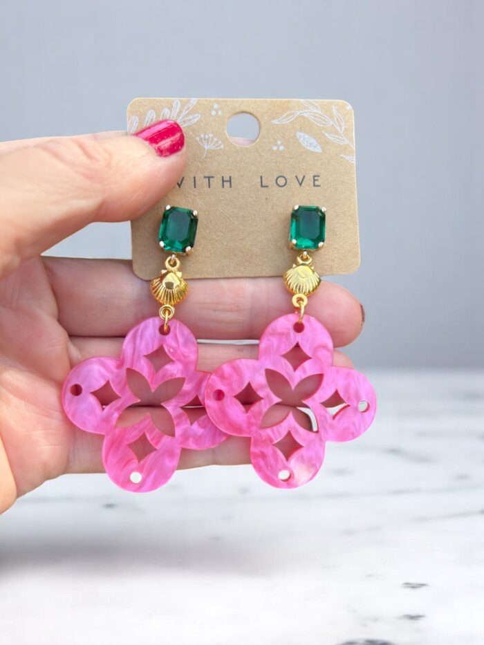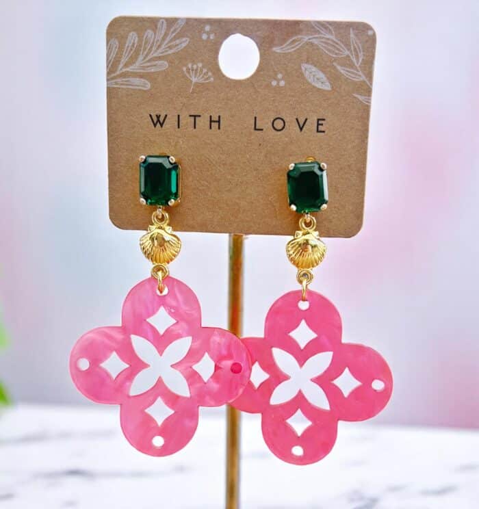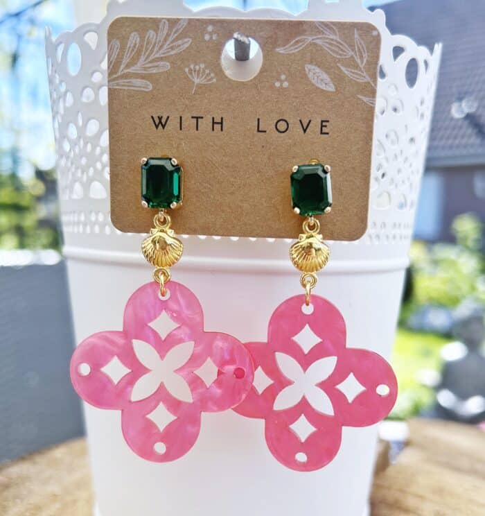 Die Ohrringe NAZRET vereinen sommerliche Leichtigkeit mit hochwertiger Verarbeitung und außergewöhnlicher Farbkombination. Das kräftige Pink der Resin-Anhänger, kombiniert mit goldfarbenen Muschelelementen und smaragdgrünen Kristallsteckern, macht dieses Schmuckstück zu einem echten Statement – ideal für alle, die Farbe, Stil und das gewisse Etwas lieben.