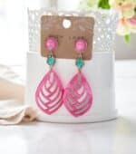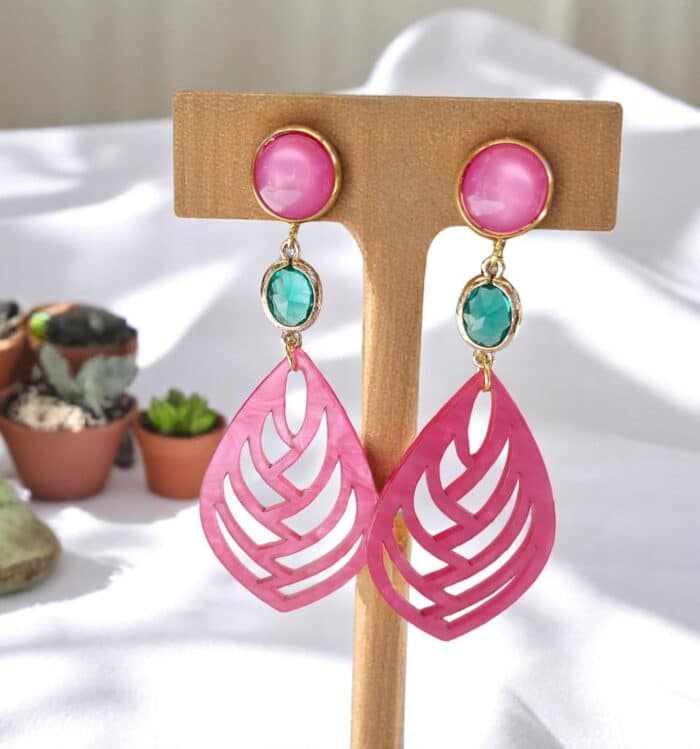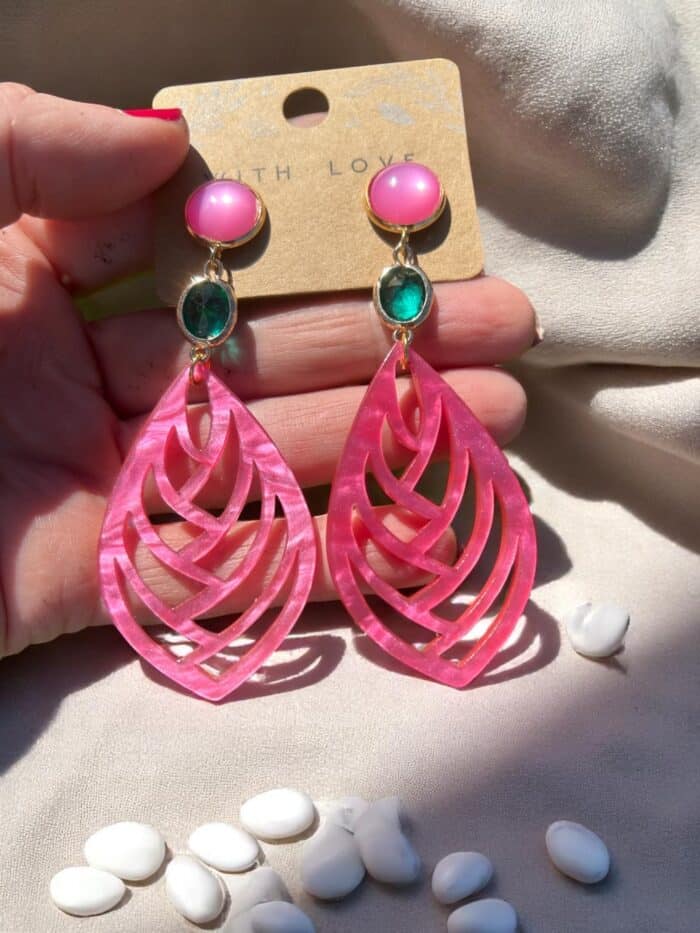 Die Ohrringe präsentieren sich mit großen, kunstvoll gearbeiteten Anhängern aus hochwertigem Resin (Naturharz). Die Farbe: ein leuchtendes Pink, das durch die schimmernde Oberfläche lebendig und tief wirkt. Diese Farbkraft macht die Ohrringe zu einem echten Blickfang – perfekt für Sommerabende, Festivals oder den besonderen Auftritt im Alltag.