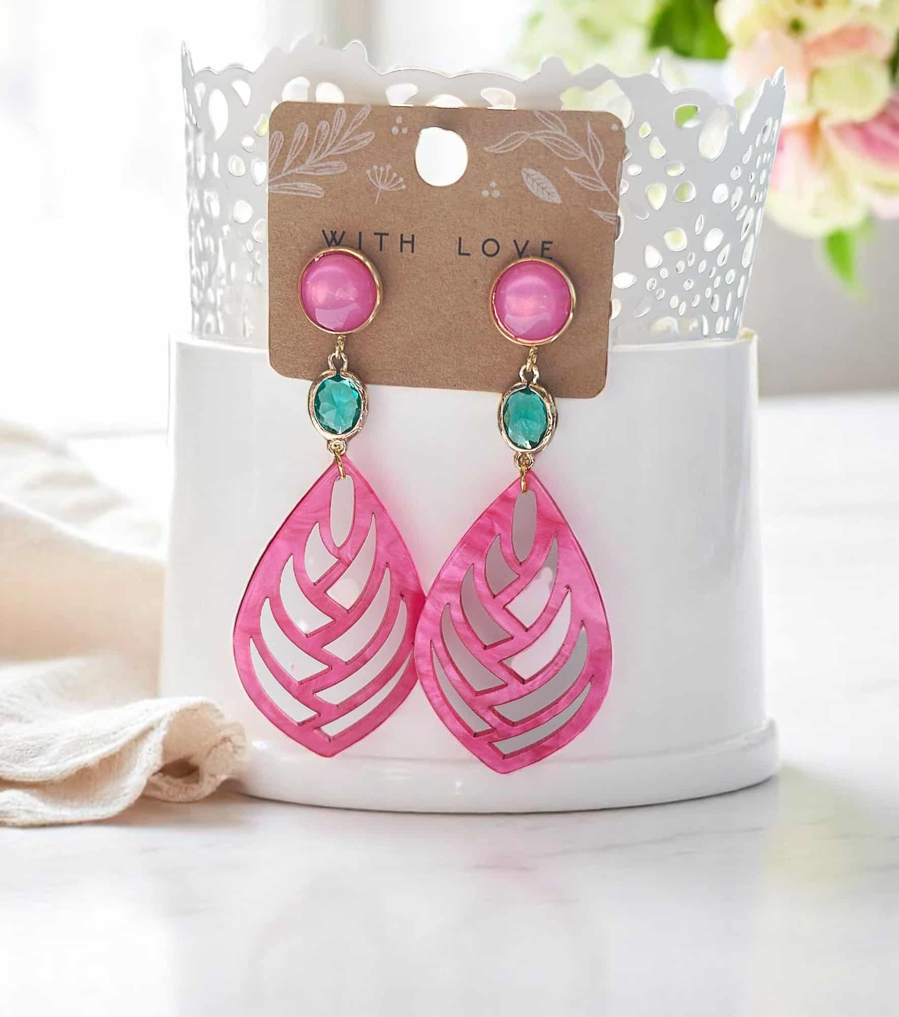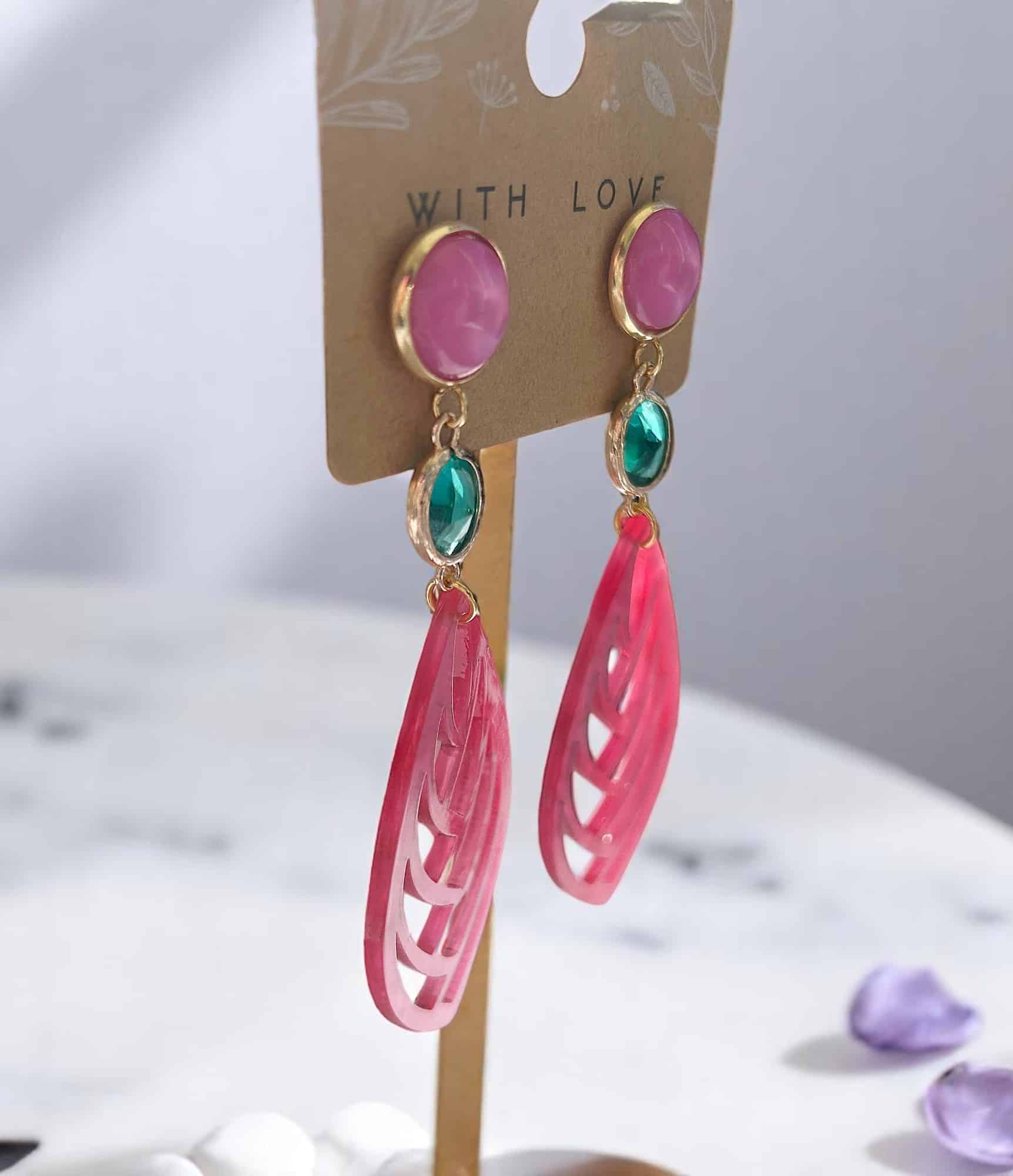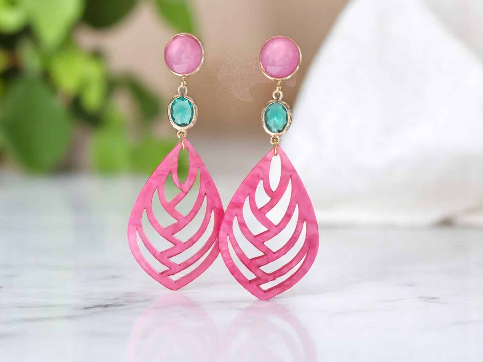 Schimmernde Statement-Ohrringe in Pink mit türkisfarbenem Kristall & vergoldetem Detail. Auffällig, leicht & hochwertig verarbeitet.