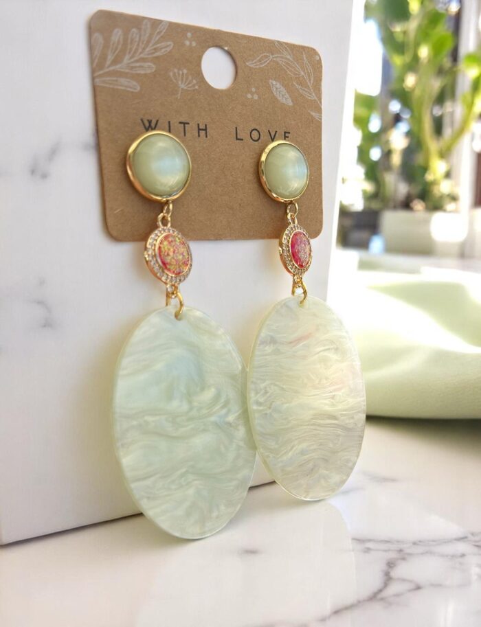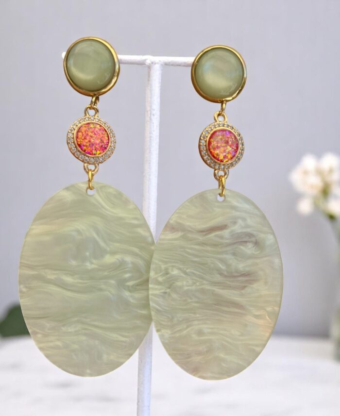 Schimmernde Statement-Ohrringe in lindgrün, pink & hummer mit Polaris Cabochon – elegant, farbenfroh & federleicht.