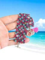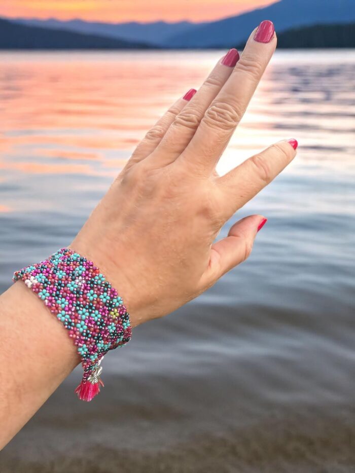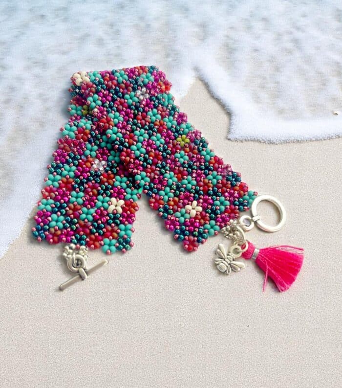 Das Design des Perlenarmbands erinnert an einen bunten Frühlingsgarten. Durch die raffinierte Fädeltechnik entstehen stilisierte kleine Blumen, die sich zu einem harmonischen Blütenmuster verbinden. Die Farben – ein lebendiger Mix aus Türkis, Pink, Weiß, Hellgrün und Blau – erzeugen eine positive, lebensfrohe Ausstrahlung. Unterstützt wird dieser Eindruck durch die glänzenden, metallisch schimmernden Perlen, die dem Armband eine edle Note verleihen.