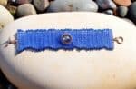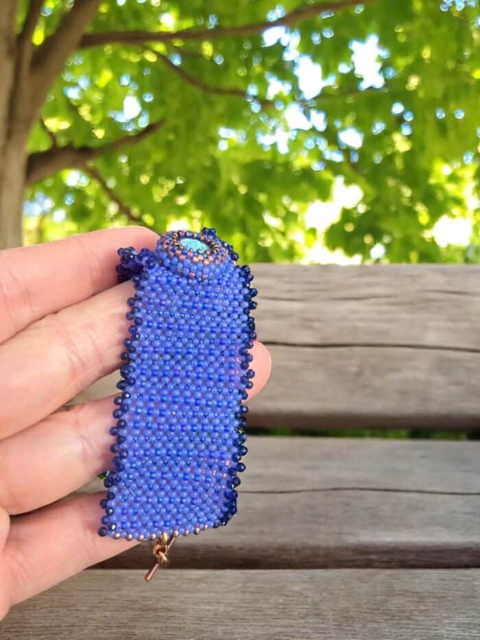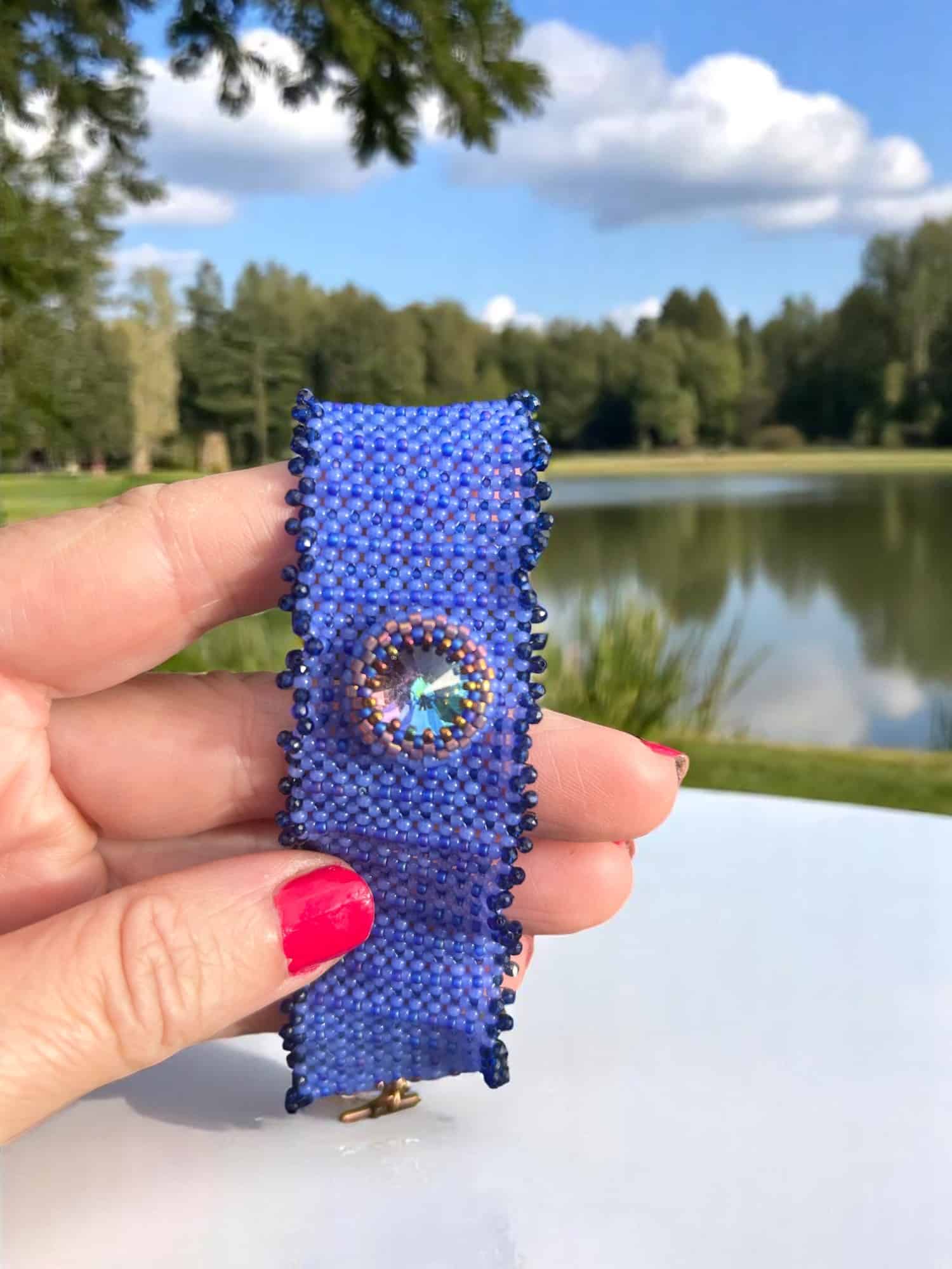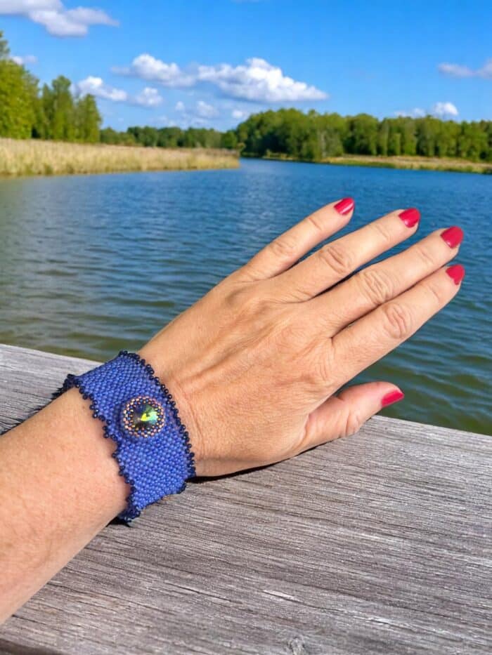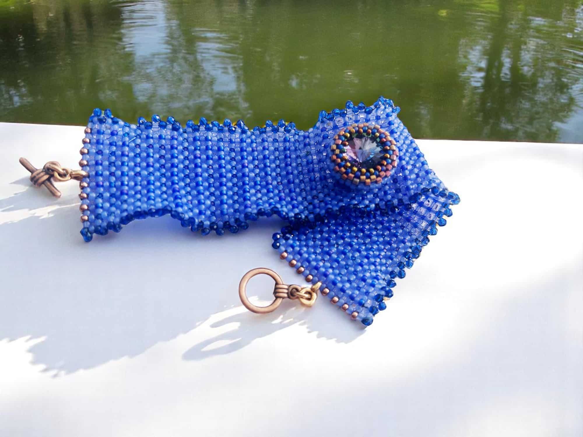 Du erhältst ein handgewebtes Perlenarmband BLUE SEA in den Farben Blau und Kupfer mit Rivoli-Kristall, Knebelverschluss und sorgfältiger Verarbeitung – jedes Stück ein echtes Unikat.