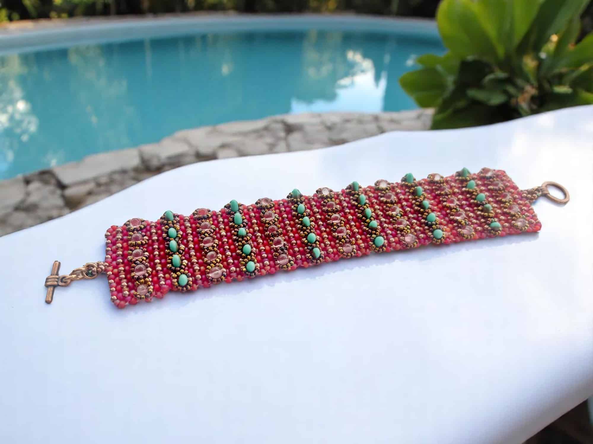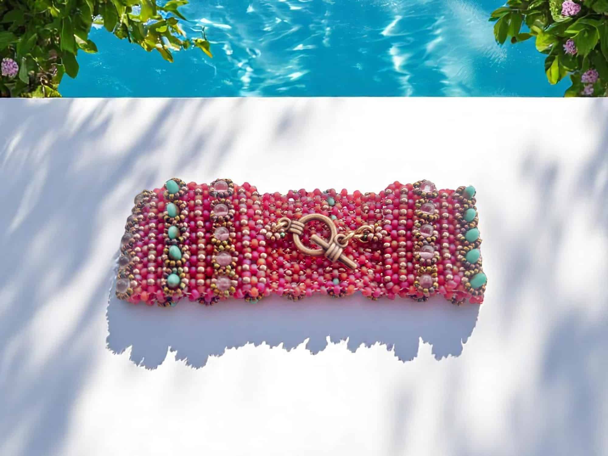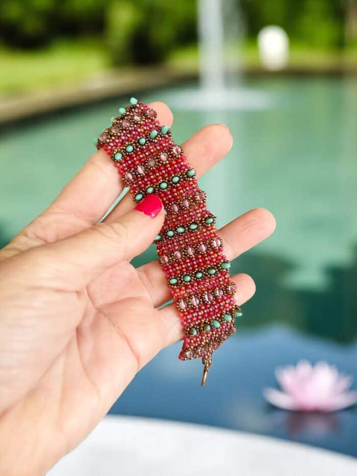 Das Perlenarmband MARAKESH BERRY ist ein leuchtendes Beispiel für handgefertigten Schmuck mit Charakter. Mit großer Sorgfalt wurden feinste Miyuki-Perlen und farbige böhmische Glasperlen zu einem eindrucksvollen Muster verwoben – ganz ohne den Einsatz eines Webrahmens. Jeder Schritt der Herstellung erfolgt in echter Handarbeit, wodurch jedes einzelne Stück zum Unikat wird.
