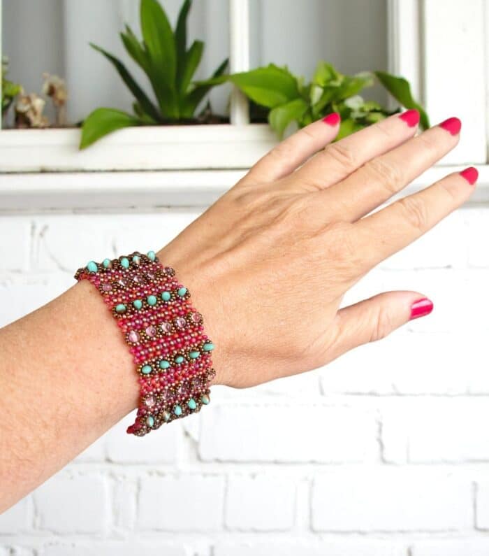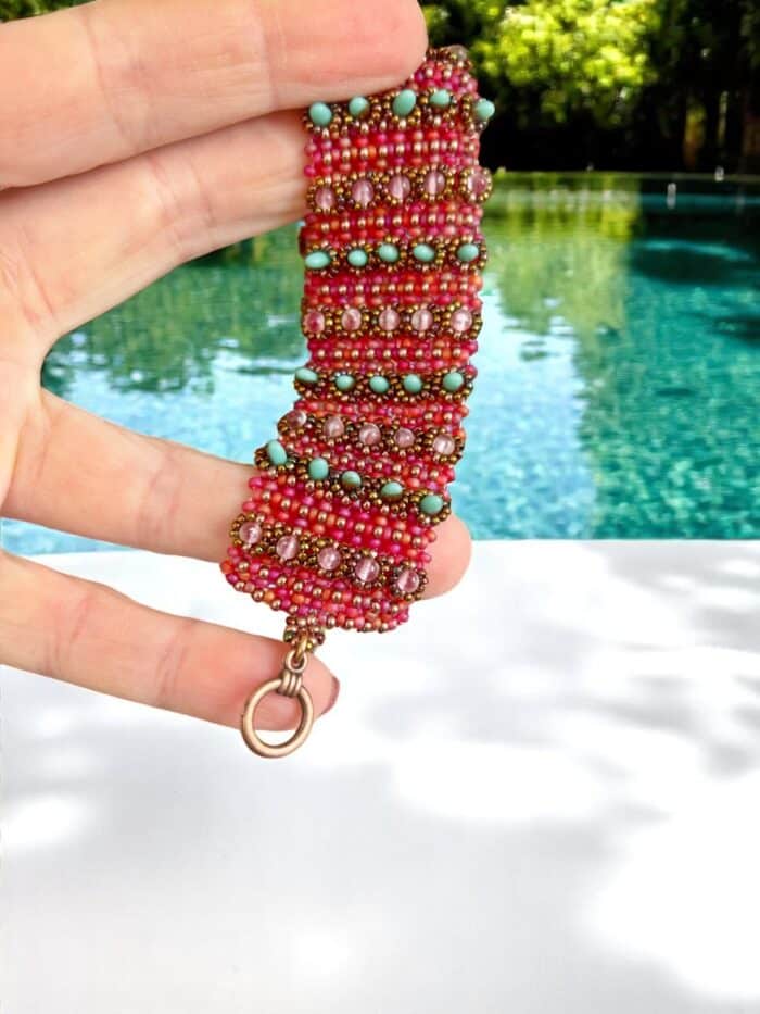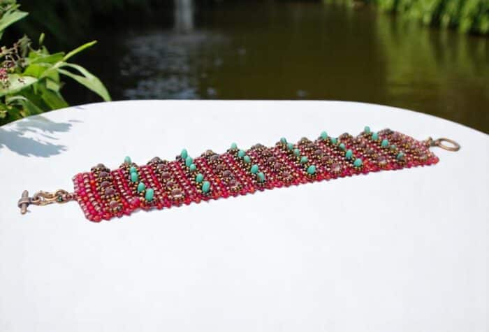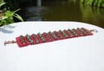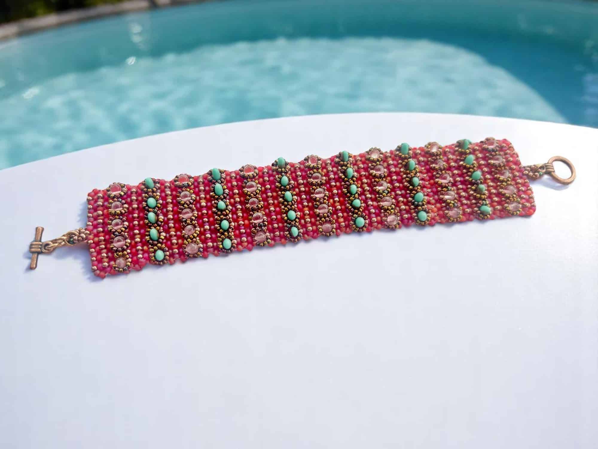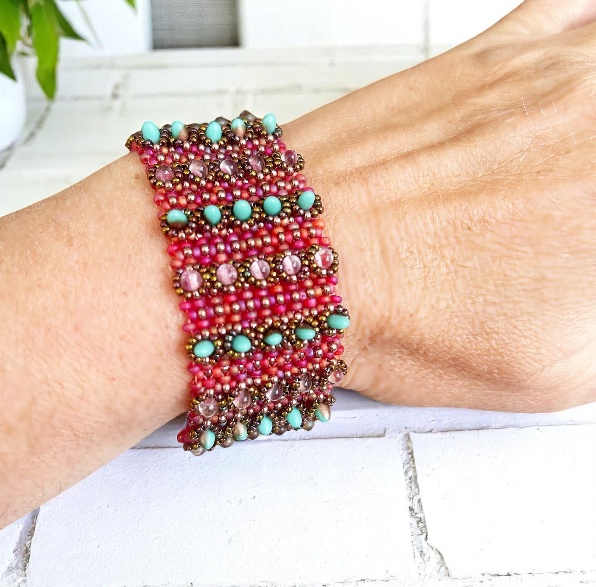 Das Perlenarmband MARAKESH BERRY ist ein leuchtendes Beispiel für handgefertigten Schmuck mit Charakter. Mit großer Sorgfalt wurden feinste Miyuki-Perlen und farbige böhmische Glasperlen zu einem eindrucksvollen Muster verwoben – ganz ohne den Einsatz eines Webrahmens. Jeder Schritt der Herstellung erfolgt in echter Handarbeit, wodurch jedes einzelne Stück zum Unikat wird.