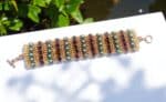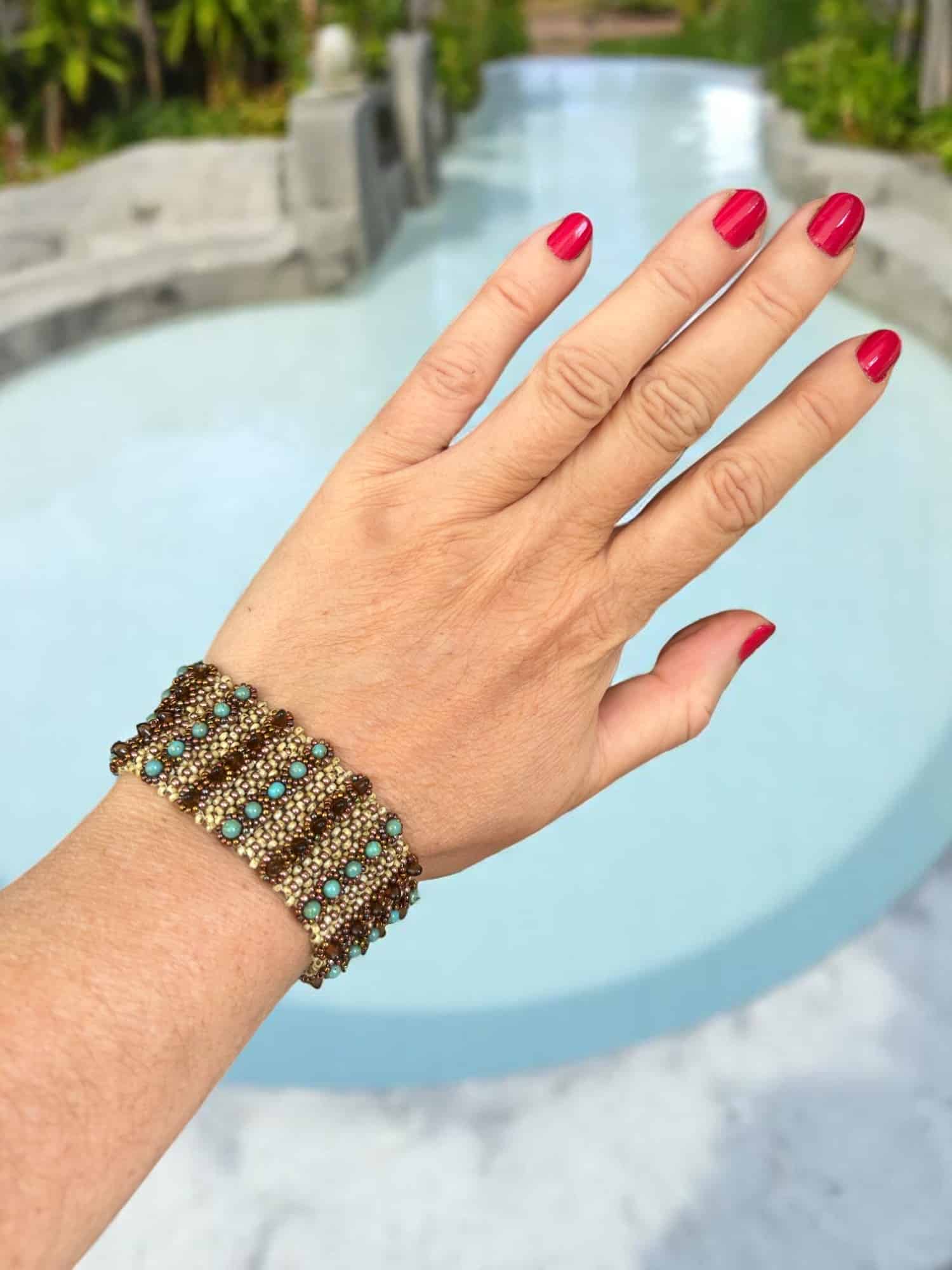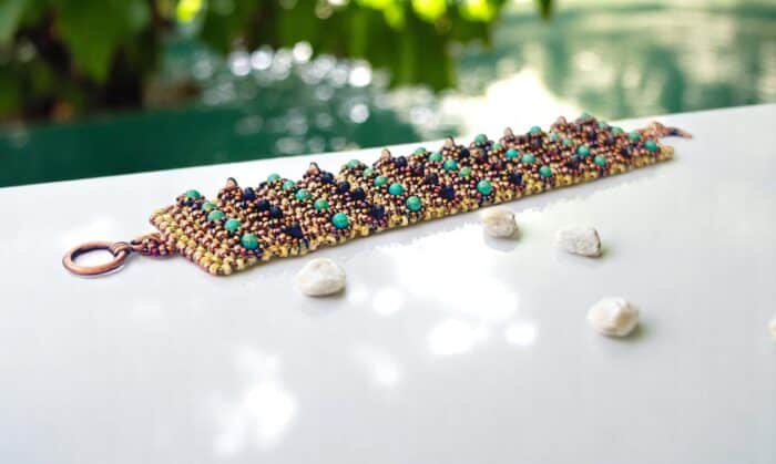 Du erhältst ein handgewebtes Perlenarmband MARAKESH EARTH aus Miyuki-Perlen, Tropfen- und Spike-Elementen, in den Farben Türkis, Beige und Kupfer. Mit kupferfarbenem Knebelverschluss – jedes Exemplar ein kleines Kunstwerk in Handarbeit.