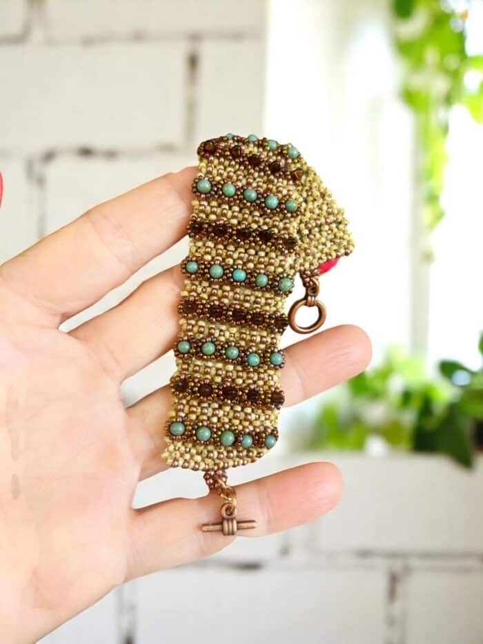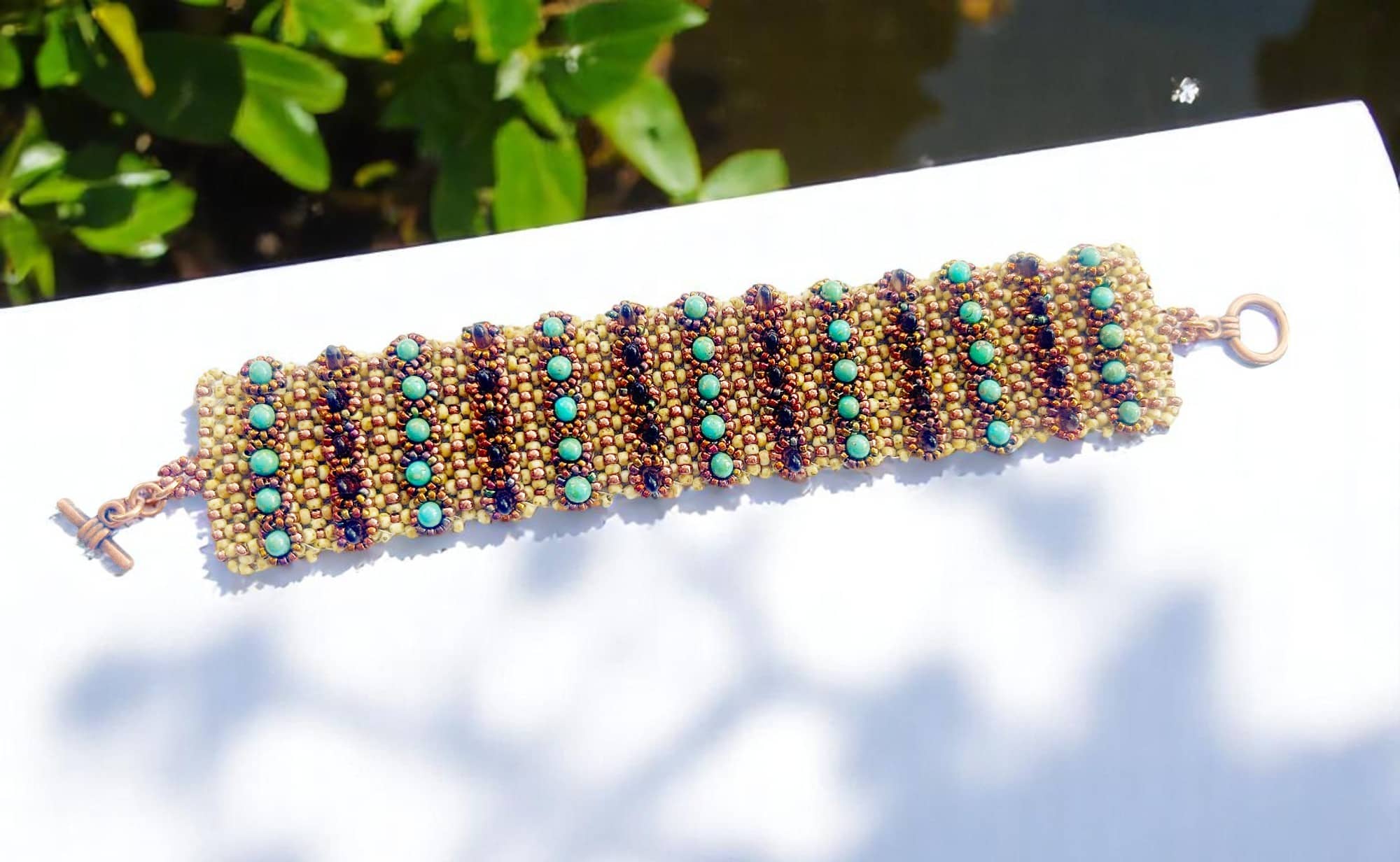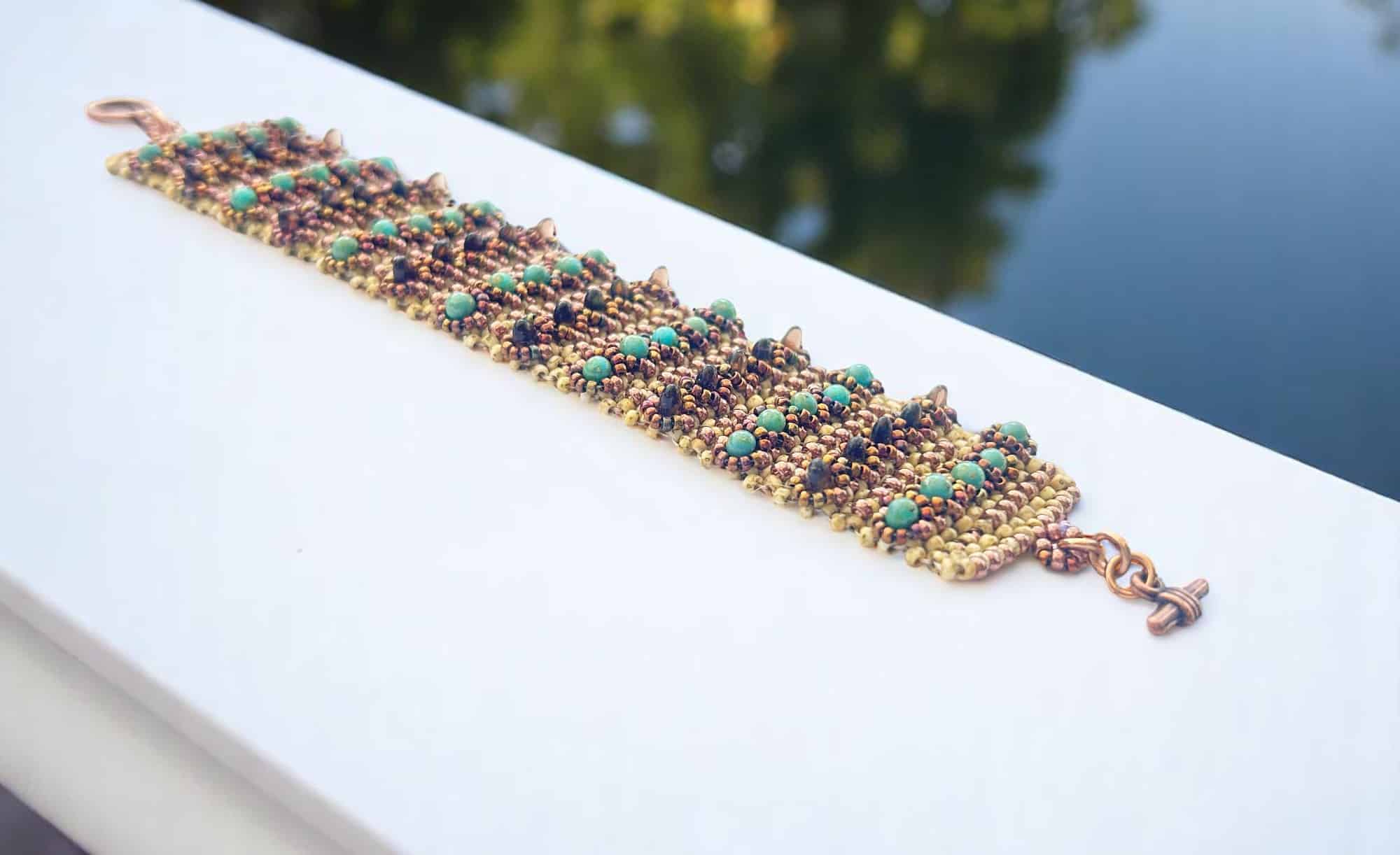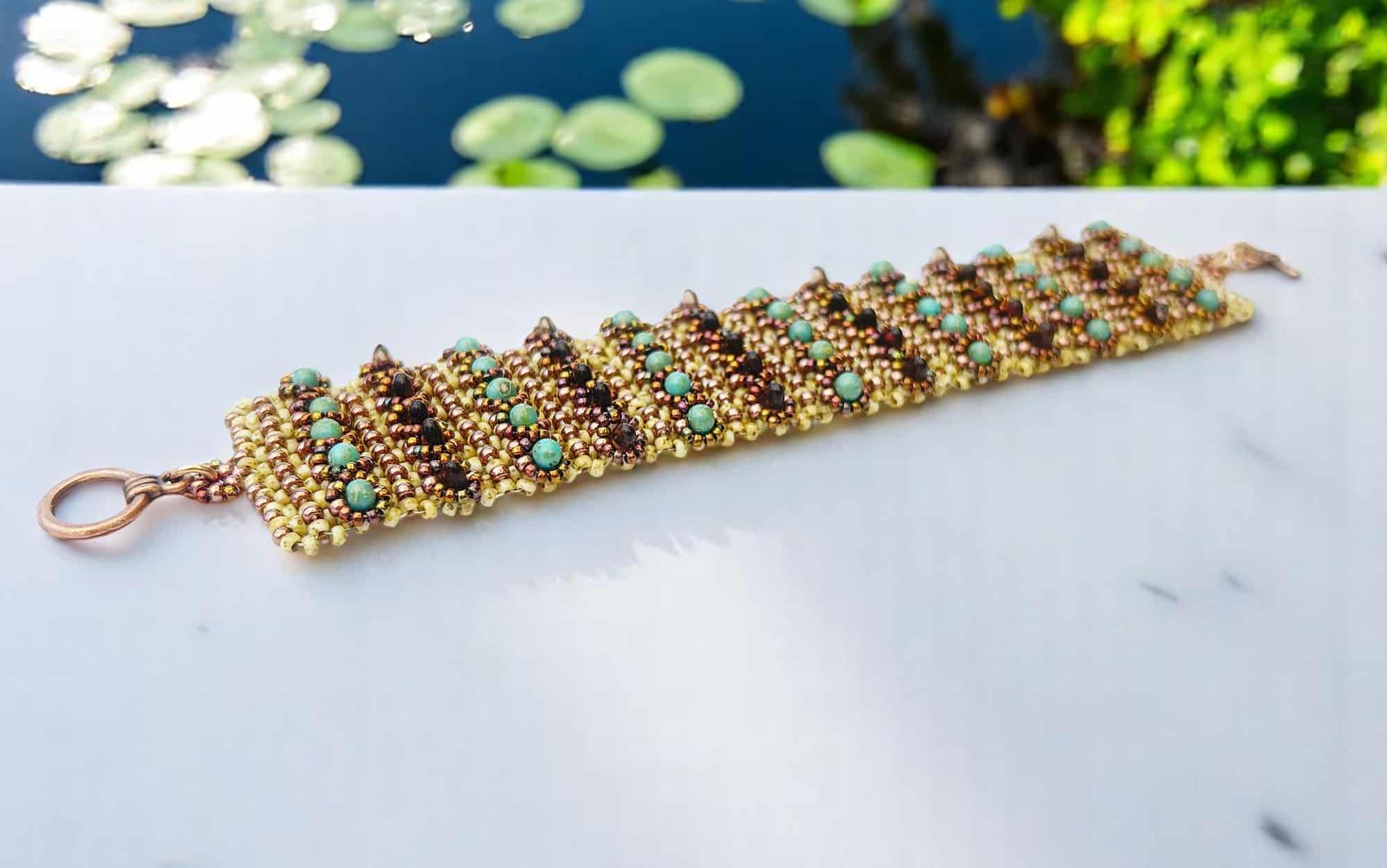 MARAKESH EARTH: Handgewebtes Perlenarmband aus Miyuki-, Tropfen- und Spike-Perlen in Türkis, Beige & Kupfer – dreidimensional, kunstvoll & nickelfrei.