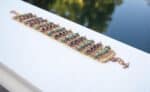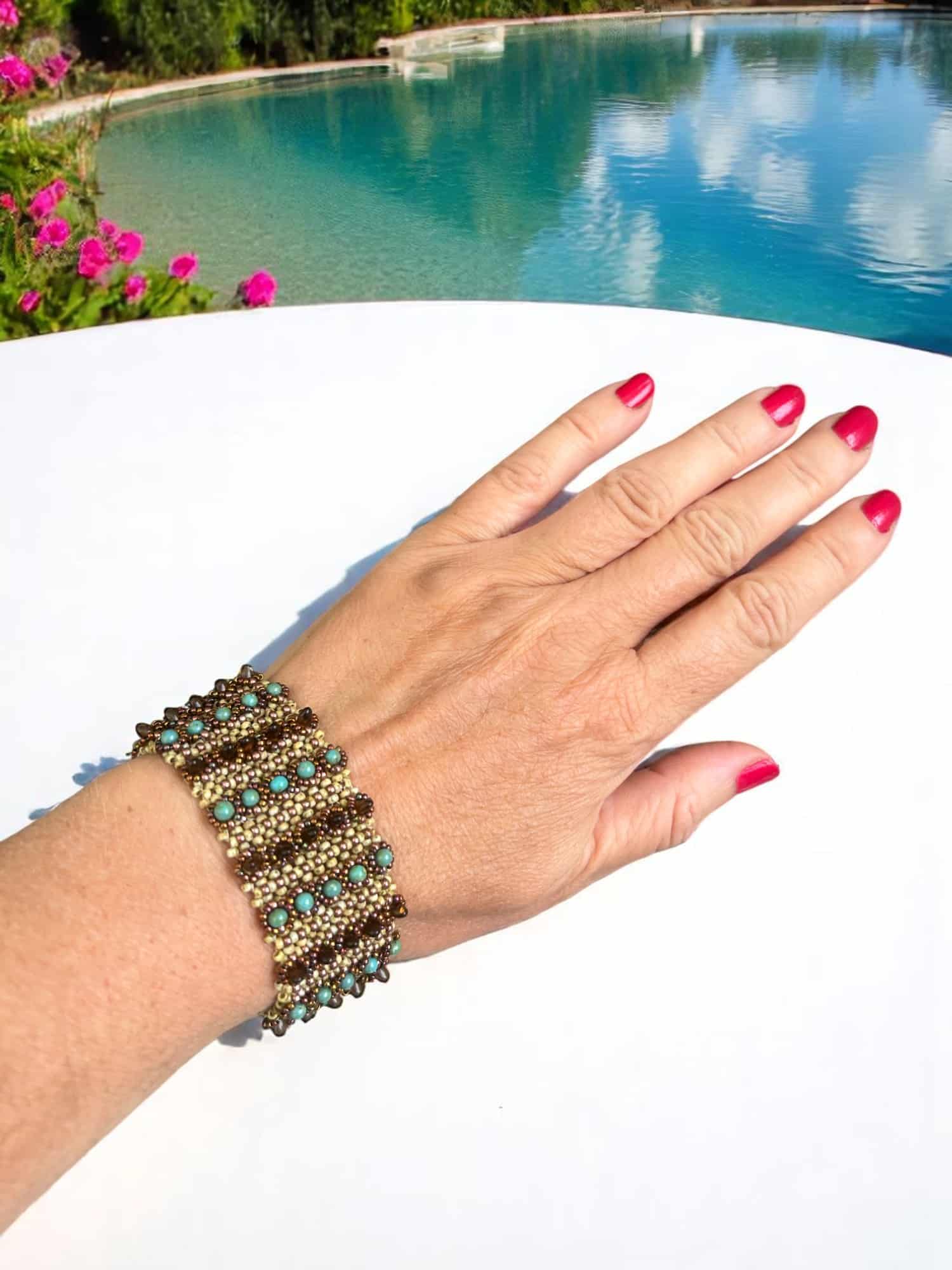 In der Farbgestaltung spiegelt sich die Inspiration aus natürlichen Erdtönen wider. Türkis symbolisiert Frische und Klarheit, während Beige mit seinem matten Picasso-Finish an Stein erinnert. Die kupferfarbenen Akzente setzen warme Highlights und unterstreichen die harmonische Farbkomposition. Diese natürliche Farbpalette macht das Armband besonders vielseitig kombinierbar – ob zu Leinen, Denim oder eleganten Stoffen.