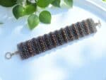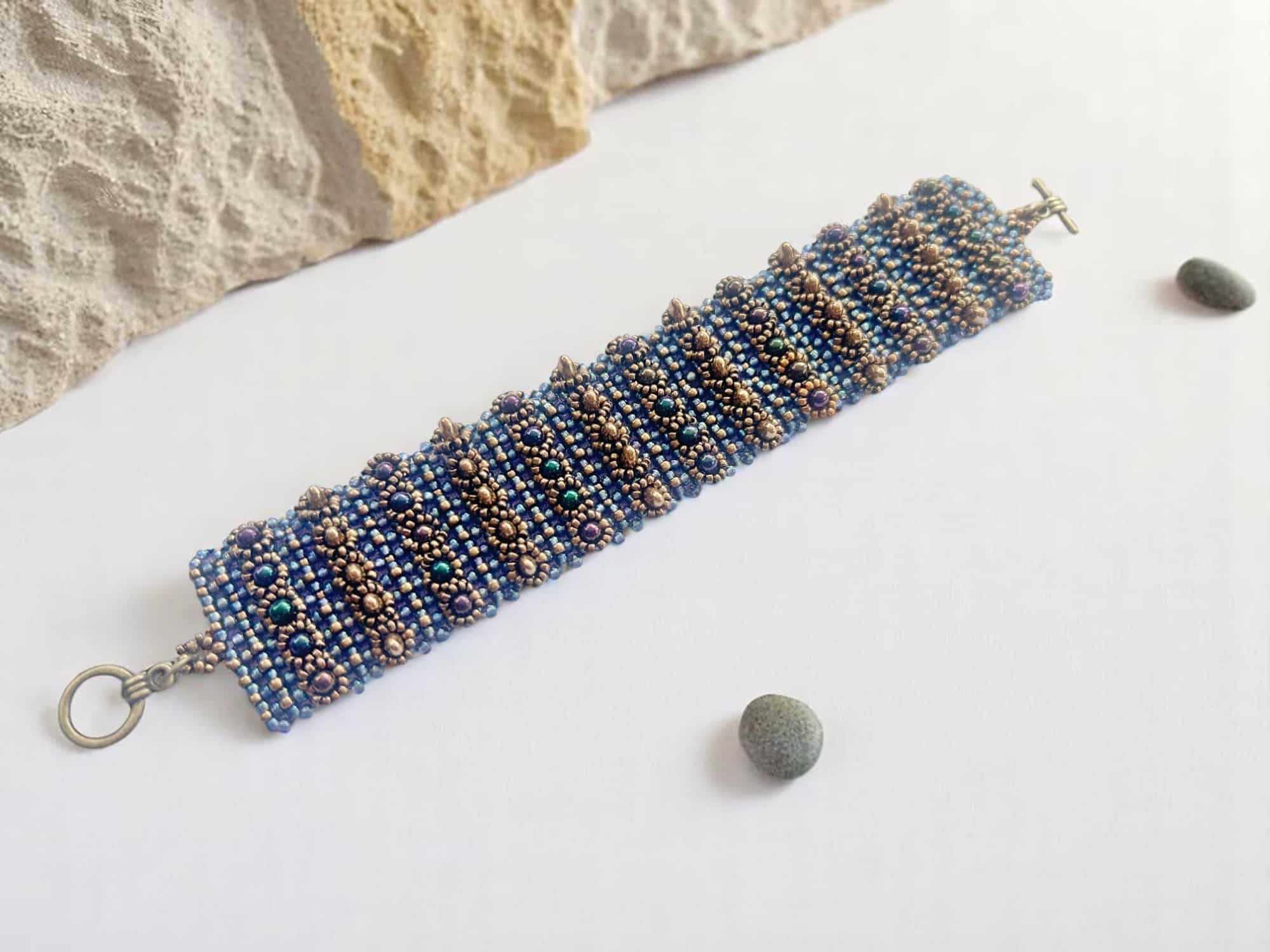 Du erhältst ein handgewebtes Perlenarmband MARAKESH NIGHT mit Miyuki-, Tropfen- und Spike-Perlen in Dunkelblau, Violett und Bronze. Mit bronzefarbenem Knebelverschluss, ca. 17,5 cm lang und 3 cm breit – ein handgemachtes Einzelstück in leuchtender Nachtoptik.