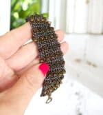 Abgeschlossen wird das Armband mit einem zarten Knebelverschluss in Bronze. Dieser ergänzt das Farbschema perfekt und sorgt für ein einfaches Anlegen bei gleichzeitig sicherem Halt. Mit einer Länge von ca. 17,5 cm und einer Breite von etwa 3 cm liegt das Armband angenehm am Handgelenk und ist für viele Handgelenkgrößen geeignet.