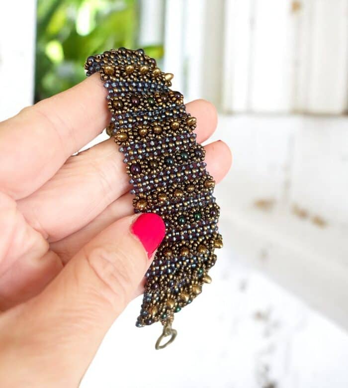 MARAKESH NIGHT: Handgewebtes Perlenarmband aus Miyuki-, Tropfen- & Spike-Perlen in Dunkelblau, Violett & Bronze – schimmernd, tief & einzigartig.