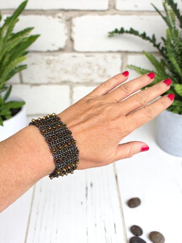 Im Gegensatz zu industriell hergestelltem Perlenschmuck wurde das Perlenarmband vollständig in Handarbeit und ohne Webrahmen gefertigt. Jede einzelne Miyuki-Perle wurde gezielt platziert und eingearbeitet. Der qualitative Unterschied ist sofort spürbar: Das Armband ist weich, flexibel und gleichzeitig formstabil – ein klares Zeichen für echte Handwerkskunst.