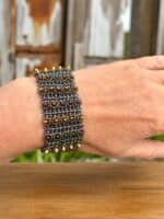 Dieses Perlenarmband hebt sich deutlich von herkömmlichem Perlenschmuck ab. Durch den gezielten Einsatz von Tropfen- und Spike-Perlen entsteht ein plastisches, strukturiertes Design mit dreidimensionalem Effekt. Jede einzelne Perle wird ohne Webrahmen in sorgfältiger Handarbeit eingefädelt – für ein flexibles, hochwertiges Tragegefühl, das sich dem Handgelenk geschmeidig anpasst. Die außergewöhnliche Fädeltechnik sorgt dafür, dass jede Perle exakt sitzt und das Muster klar zur Geltung kommt.