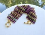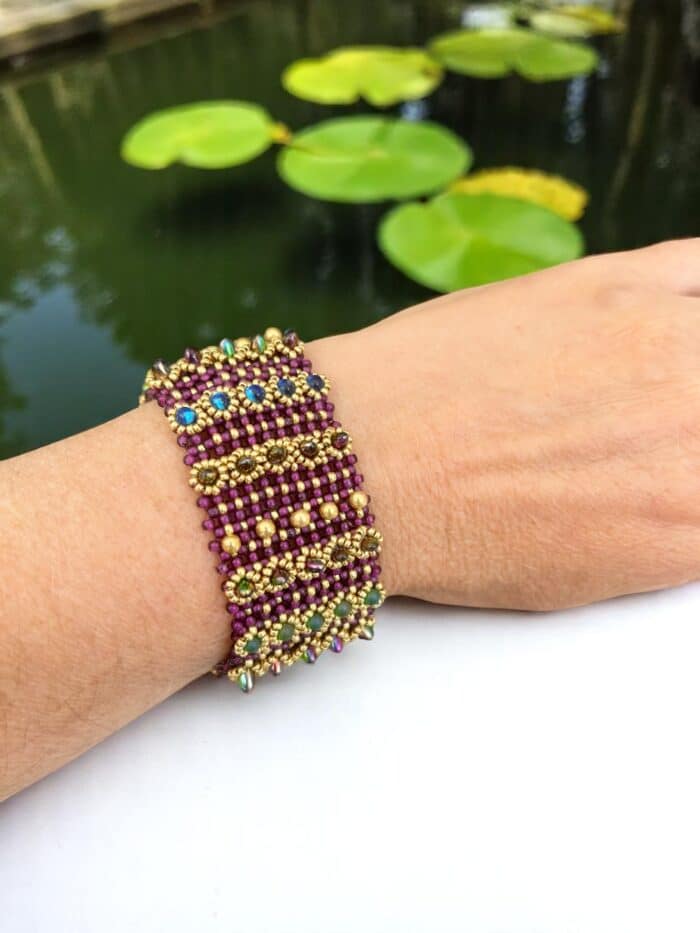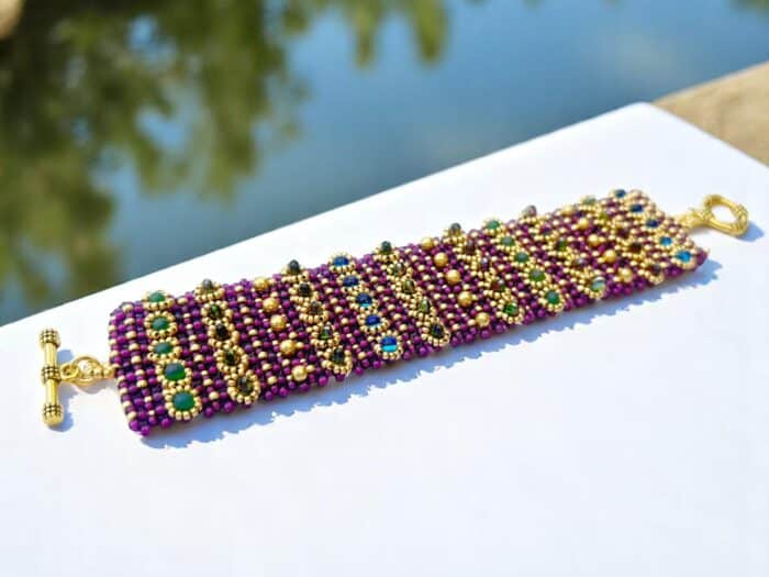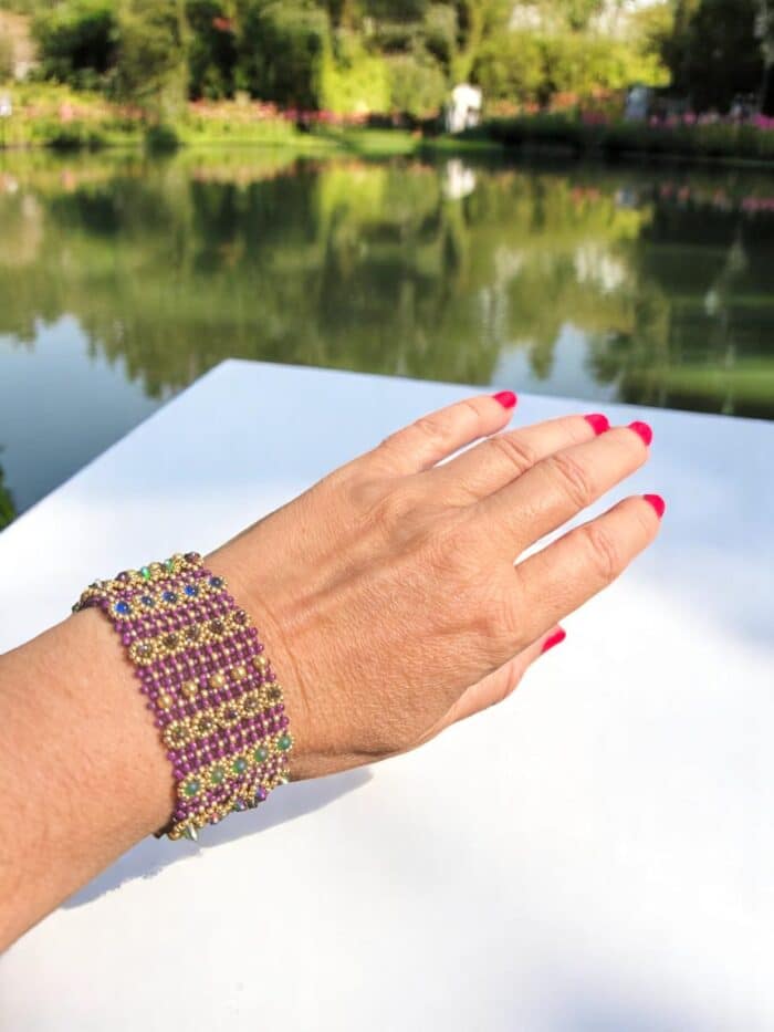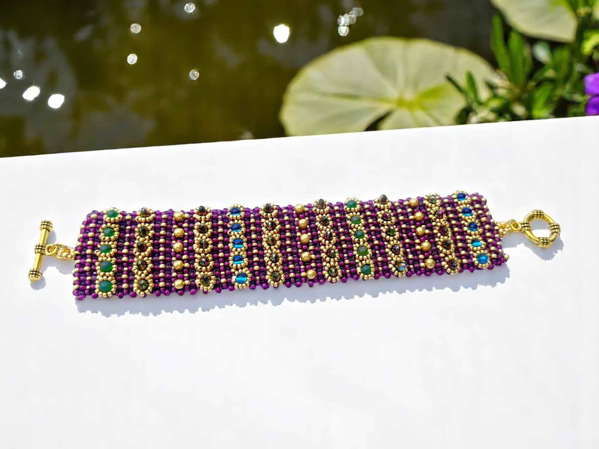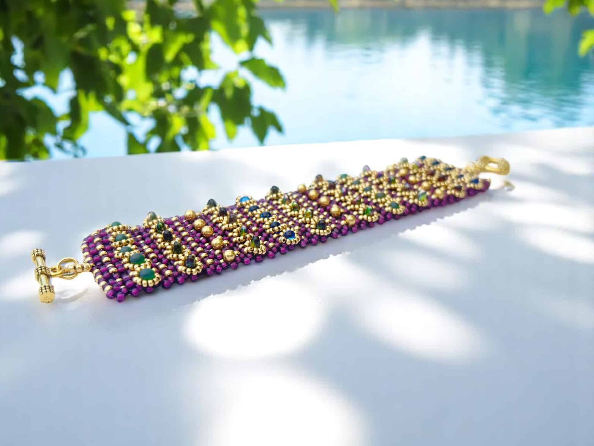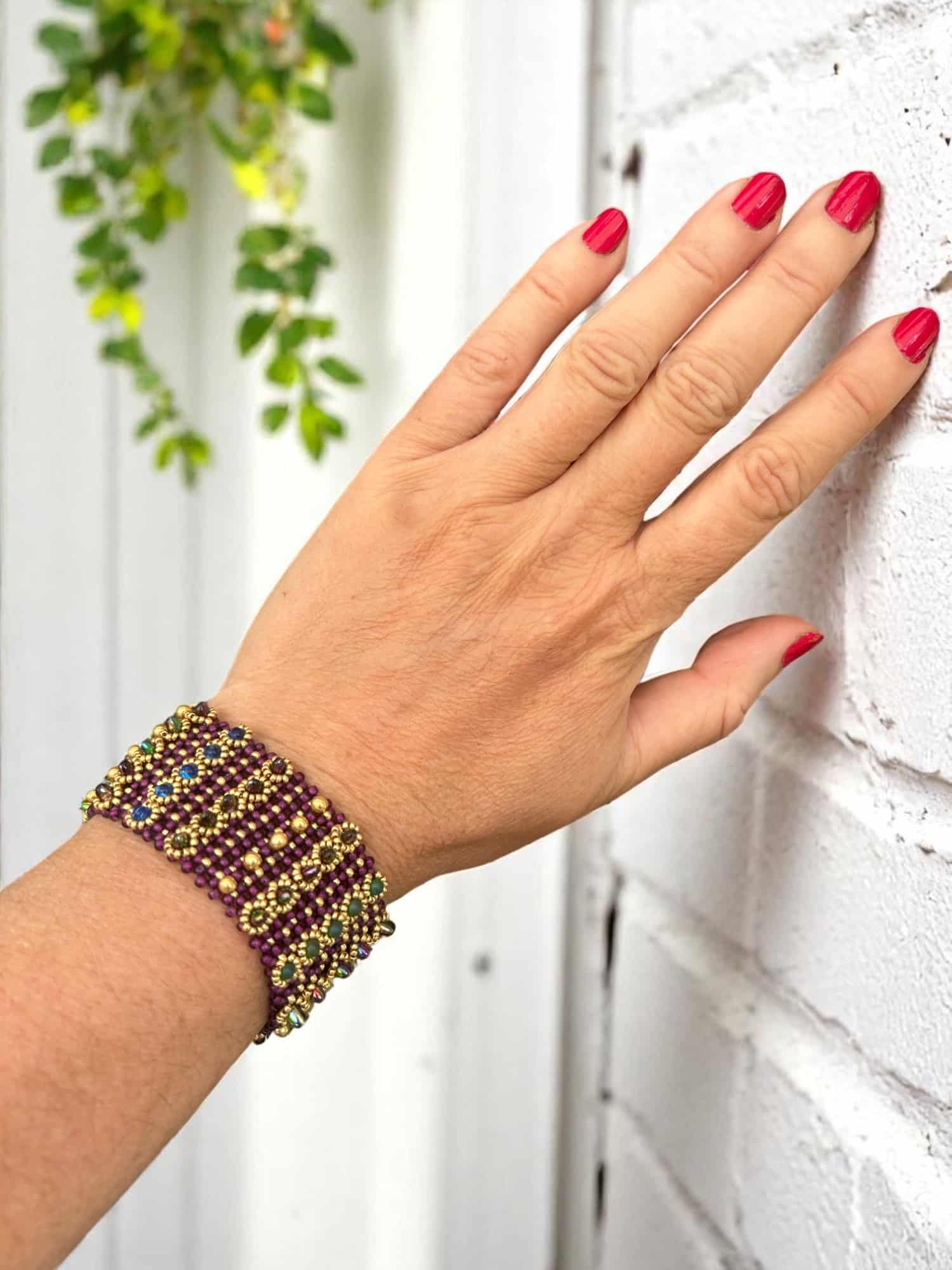 MARAKESH PURPLE: Handgewebtes Perlenarmband aus Miyuki-, Spike- und Tropfenperlen in Violett, Grün, Blau & Gold – kunstvoll, lebendig & elegant.