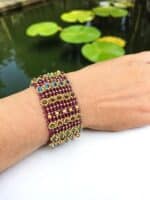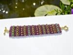 Du erhältst ein handgewebtes Perlenarmband MARAKESH PURPLE, gefertigt aus Miyuki-, Tropfen- und Spike-Perlen in Violett, Blau, Grün und Gold. Mit goldfarbenem Knebelverschluss, ca. 17 cm lang, 3 cm breit – ein stilvolles Unikat in leuchtender Farbwelt.