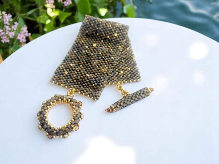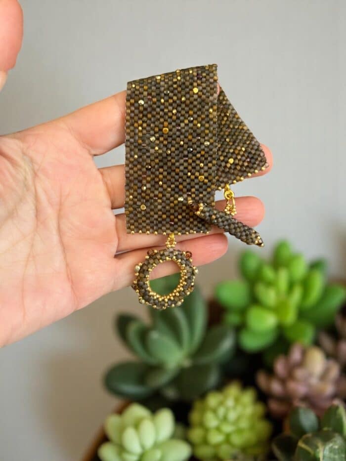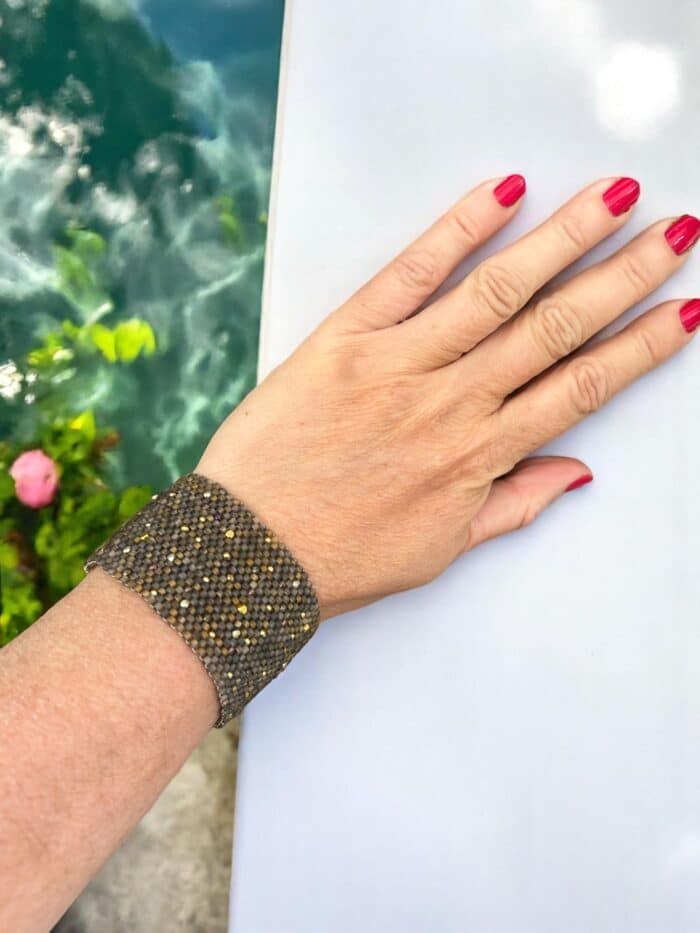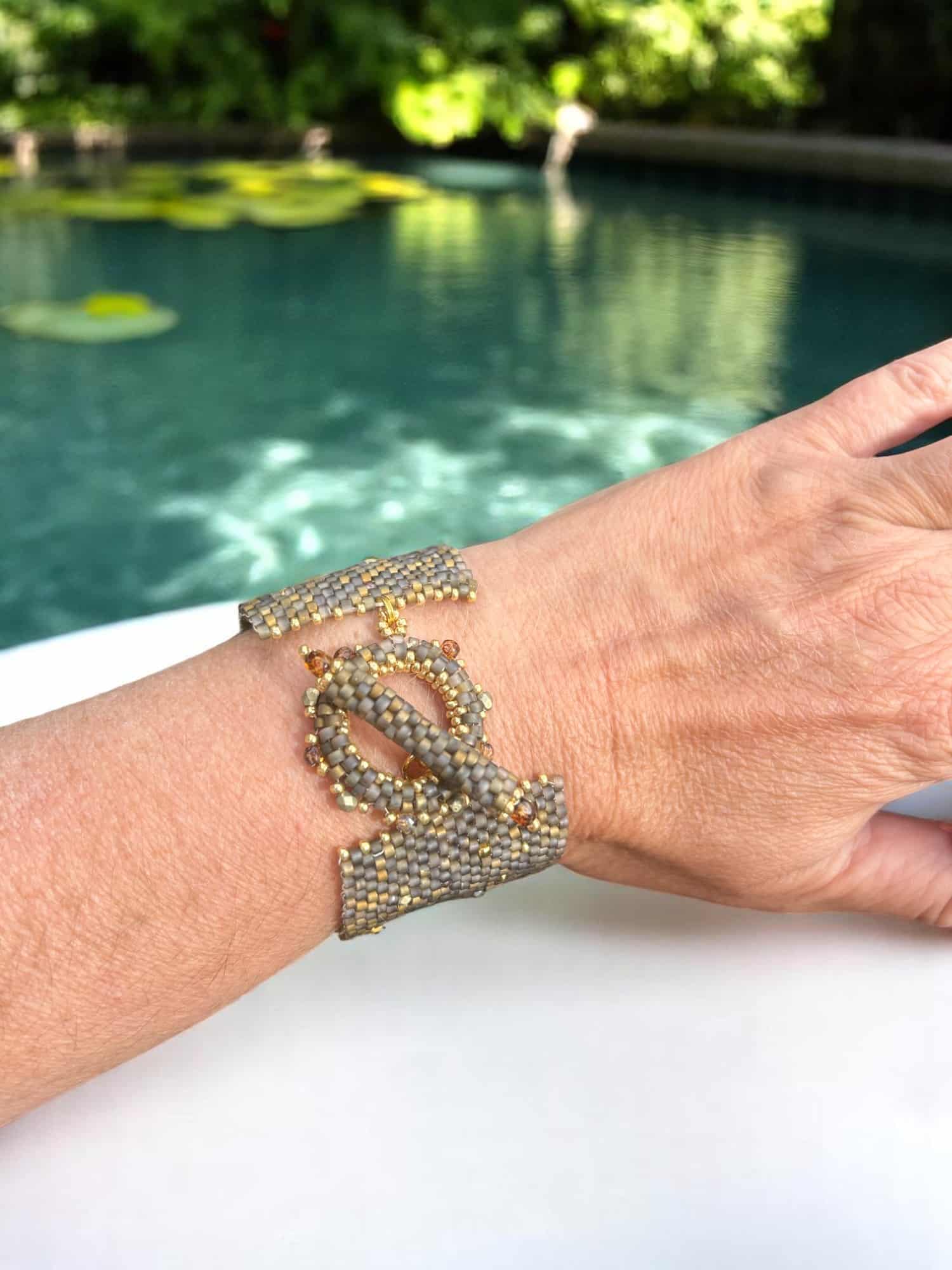 Das Armband wird vollständig ohne Webrahmen gefertigt. Jede einzelne Perle wird mit der Nadel eingefädelt und exakt positioniert – eine Technik, die Geschick, Geduld und Präzision erfordert. Dadurch entsteht ein flexibles, aber stabiles Schmuckstück, das sich angenehm dem Handgelenk anpasst und sich durch seine hochwertige Verarbeitung deutlich von maschinell produzierten Armbändern abhebt.