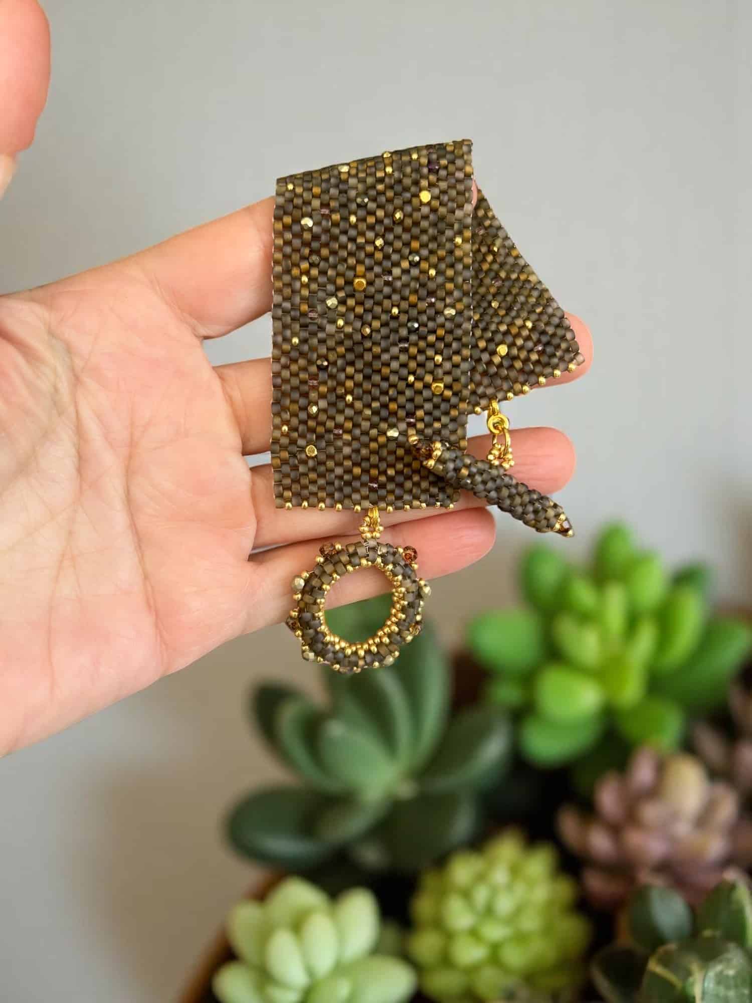 MEMPHIS BROWN: Handgewebtes Perlenarmband aus Glasperlen & böhmischen Elementen in Kaffeebraun & Gold – breit, edel & mit von Hand gefertigtem Verschluss.