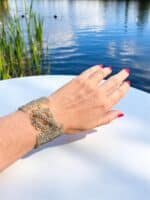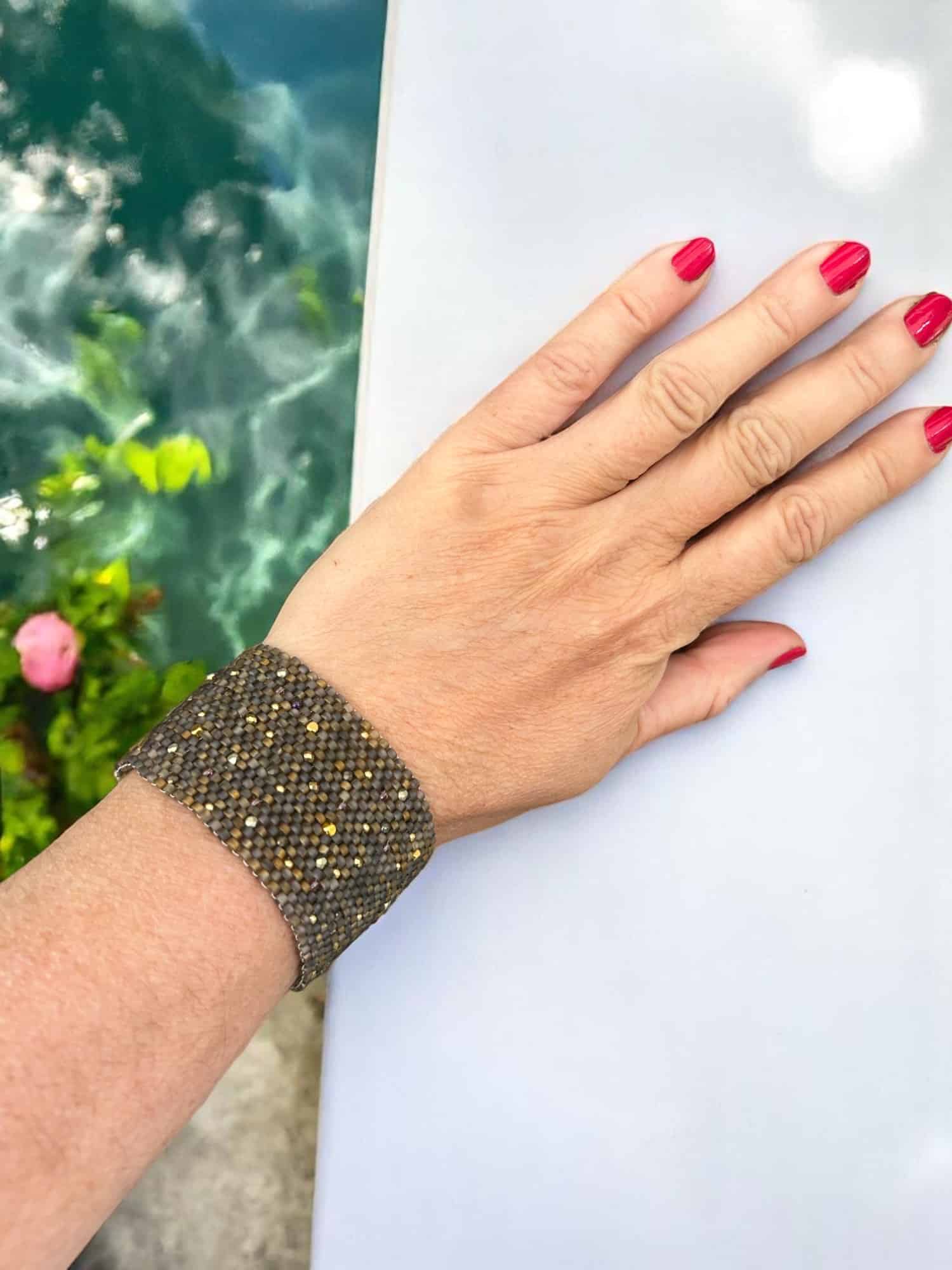 Du erhältst ein handgewebtes Perlenarmband MEMPHIS BROWN, gefertigt aus kaffeebraunen und goldfarbenen Glasperlen, ergänzt durch böhmische Perlen und einen von Hand gestalteten Knebelverschluss. Länge ca. 19 cm, Breite ca. 3,8 cm – ein luxuriöses Statement für Dein Handgelenk.