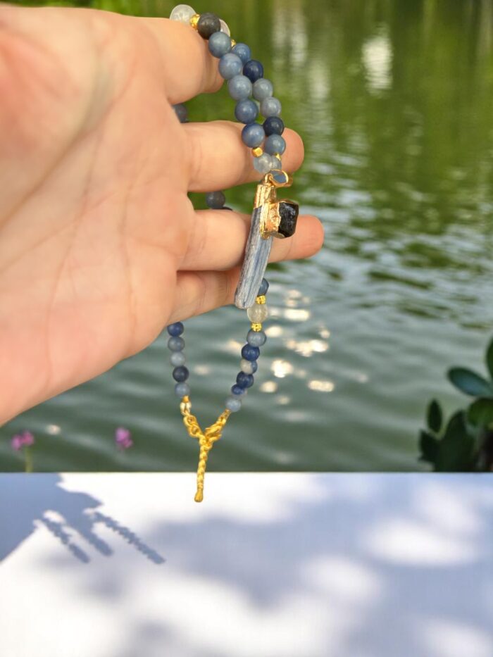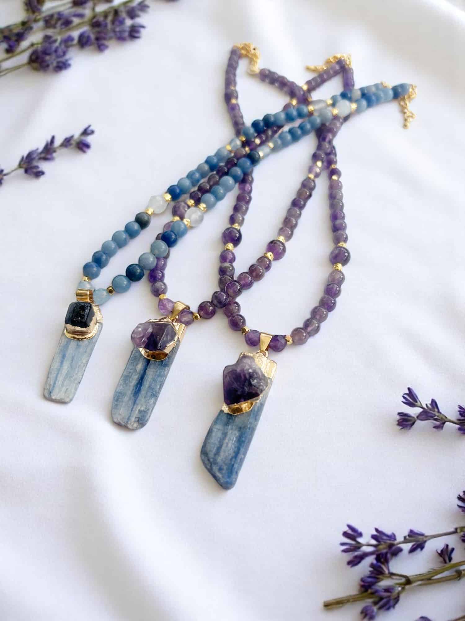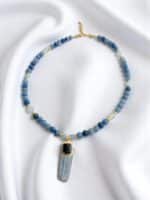 Der Mittelpunkt der Perlenkette ist ein auffälliger, vergoldeter Anhänger, der mit echtem Kyanit und Amethyst besetzt ist. Die beiden Edelsteine ergänzen sich perfekt: Der blaue Kyanit bringt Tiefe und Charakter, während der violette Amethyst für eine sanfte, elegante Note sorgt. Beide Steine schimmern je nach Lichteinfall unterschiedlich – ein faszinierender Blickfang, der die Wertigkeit dieser Perlenkette unterstreicht.