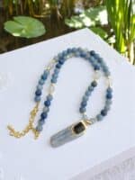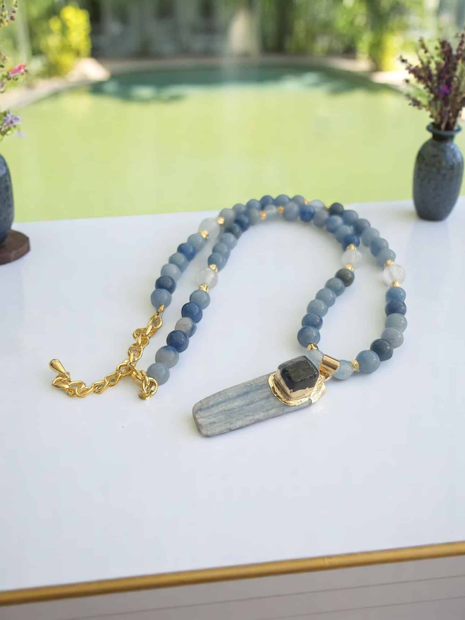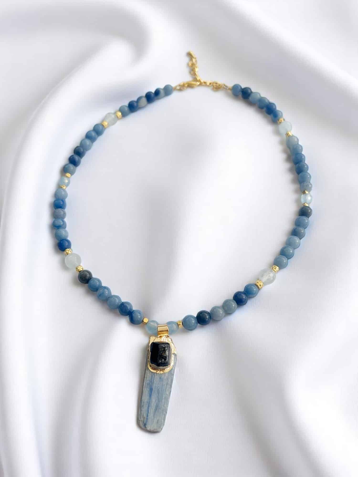 Die Perlenkette TEMPTATION BLUE vereint hochwertige Edelsteine, kunstvolles Design und luxuriöse Materialien zu einem ausdrucksstarken Schmuckstück mit besonderer Tiefe. In sorgfältiger Handarbeit gefertigt, kombiniert diese kurze Halskette taubenblauen Aventurin, fast transparente Jade, vergoldete Zwischenelemente sowie einen exklusiven Anhänger mit Kyanit und Amethyst. Das Zusammenspiel von Farbe, Glanz und Steinwirkung verleiht der Kette ihre elegante und zugleich moderne Ausstrahlung.