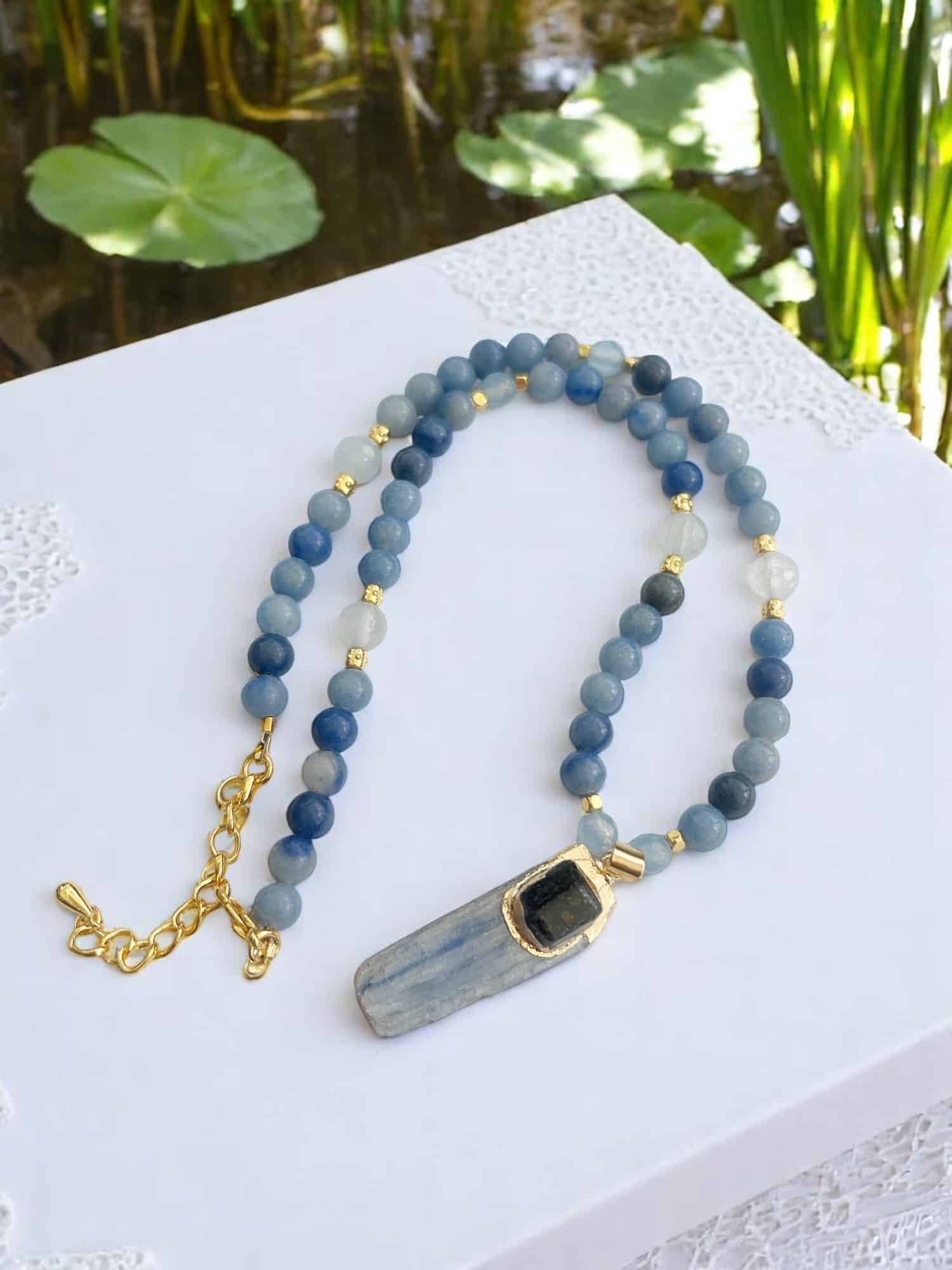 TEMPTATION BLUE: Edle Perlenkette aus Aventurin & Jade mit Anhänger aus Kyanit & Amethyst – vergoldete Elemente, ca. 44 cm + Verlängerung, nickelfrei.