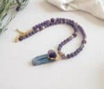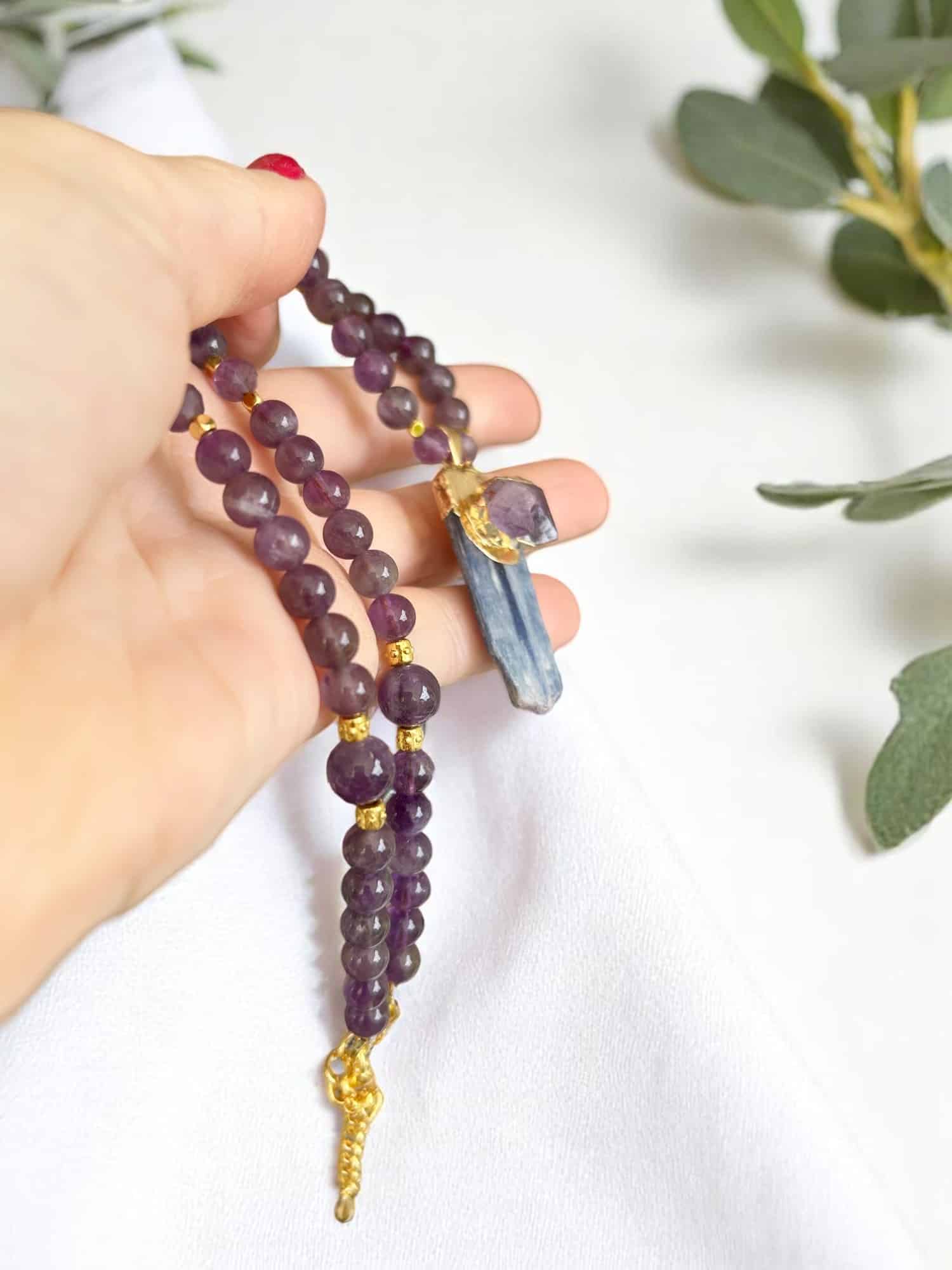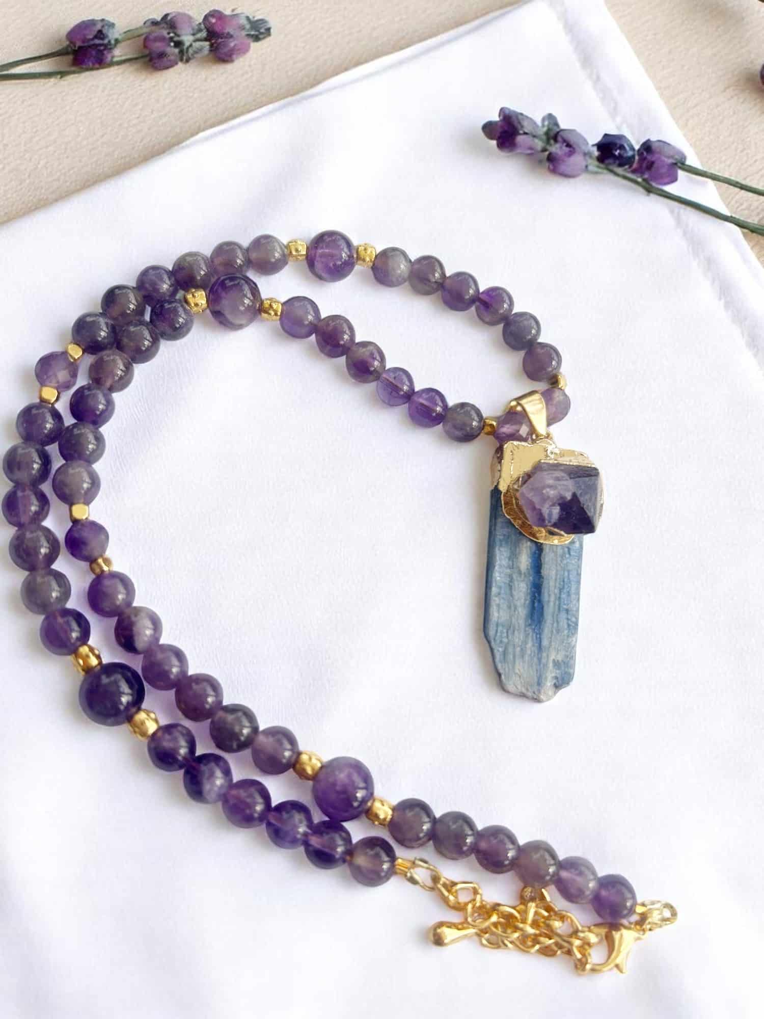 TEMPTATION PURPLE: Elegante Perlenkette aus Amethyst mit vergoldetem Anhänger, besetzt mit Kyanit & Amethyst – 44 cm + Verlängerung, hochwertig & nickelfrei.
