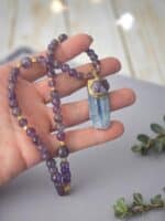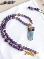 Die Perlenkette TEMPTATION PURPLE ist ein elegantes Schmuckstück, das durch hochwertige Edelsteinperlen, vergoldete Details und einen aufwendig gearbeiteten Anhänger überzeugt. In kunstvoller Handarbeit gefertigt, vereint diese Kette die faszinierende Tiefe des violetten Amethysts mit dem klaren Blau des Kyanits. Diese edle Kombination macht sie zu einem besonderen Begleiter für festliche Anlässe und stilvolle Auftritte im Alltag.