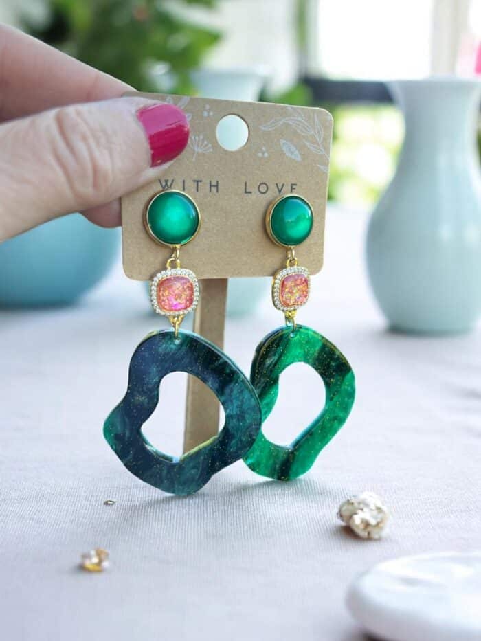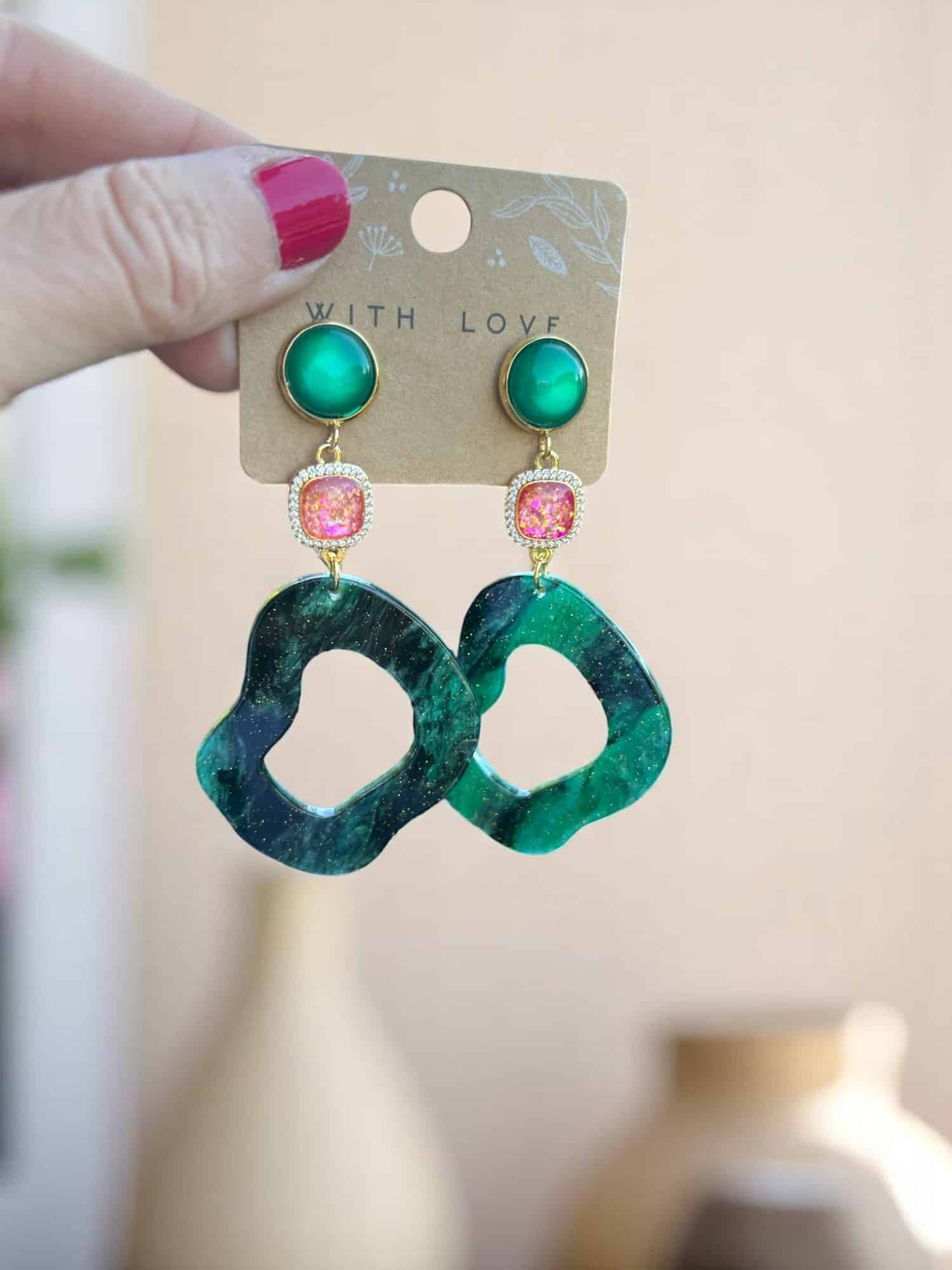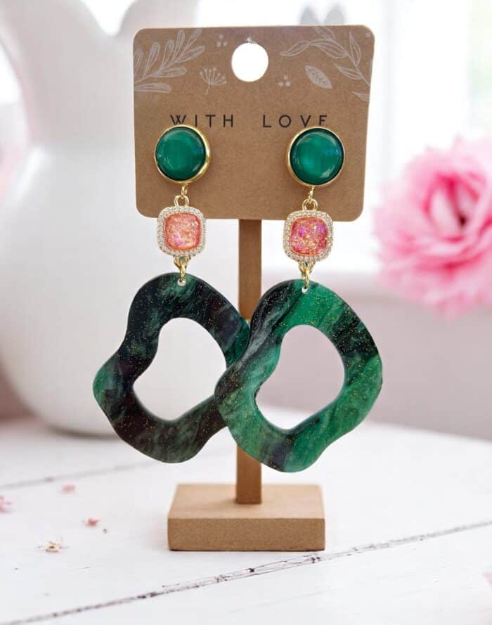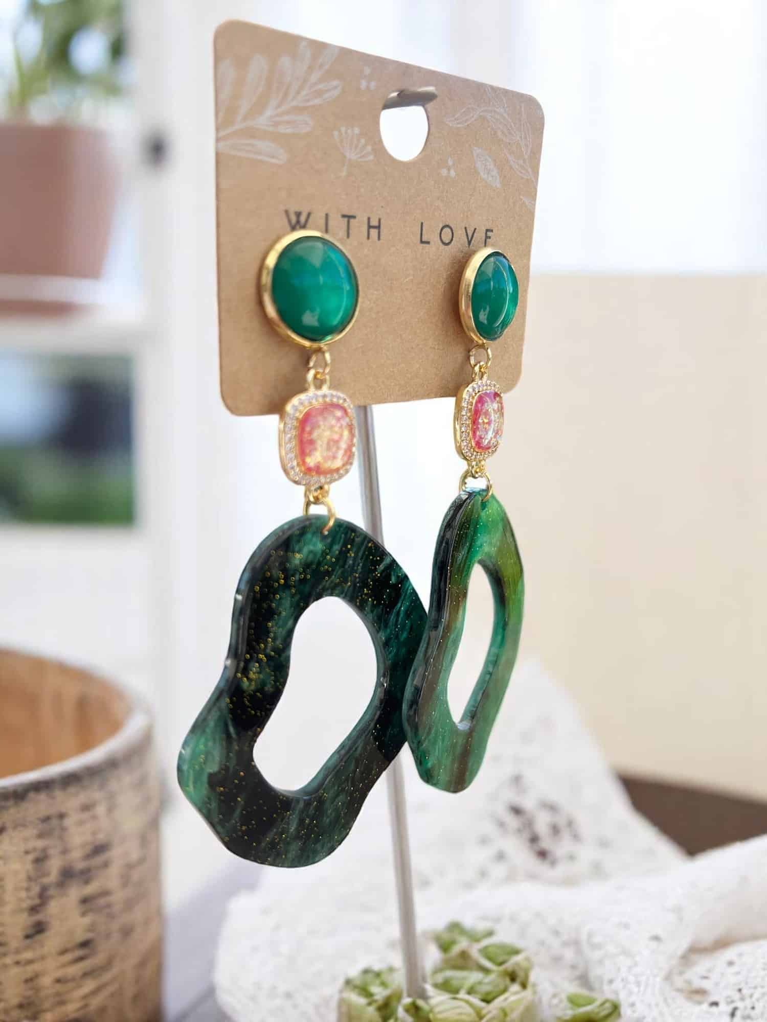Die großen Anhänger bestehen aus hochwertigem Resin – einem natürlichen Harz, das durch seine Tiefe und Leuchtkraft begeistert. Eingearbeitete Glitzerpartikel sorgen für ein faszinierendes Funkeln bei jeder Bewegung. Die Farbe changiert effektvoll zwischen Dunkelgrün, Petrol und Schwarz – ein echter Eyecatcher für Liebhaber außergewöhnlicher Ohrringe.