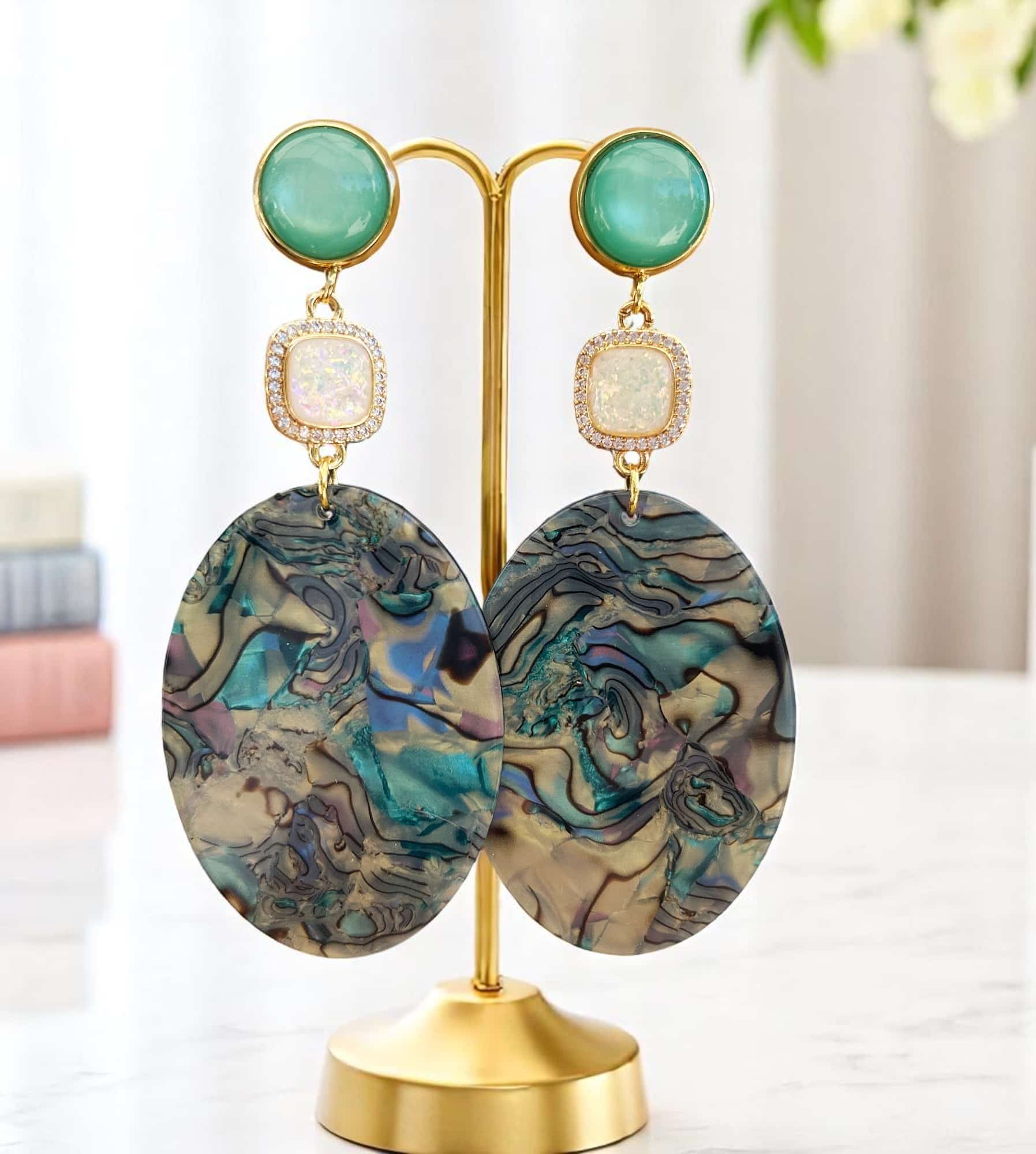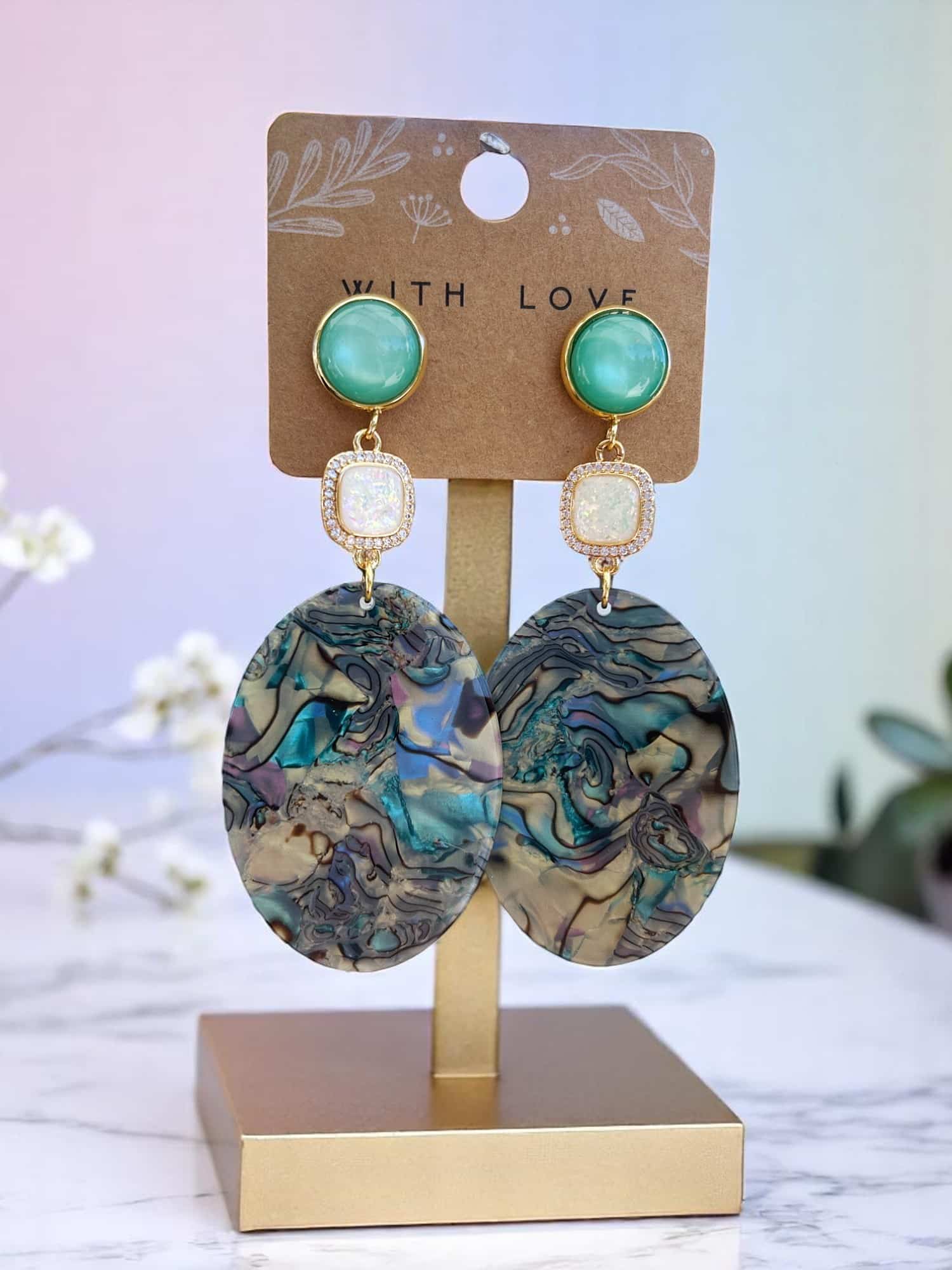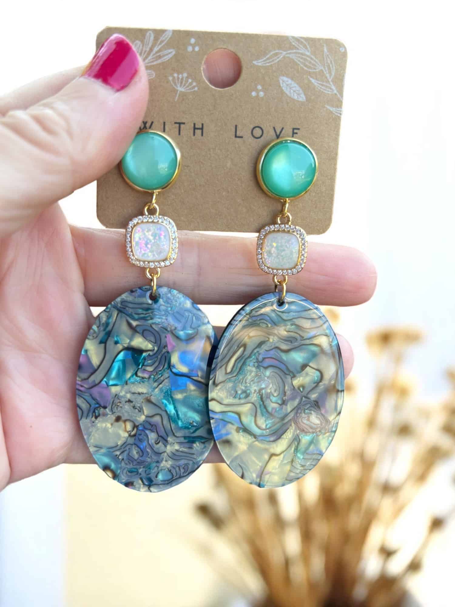 DUSTY SEA – Leuchtende Statement Ohrringe in Perlmuttoptik mit Polaris Cabochons & Glitzer