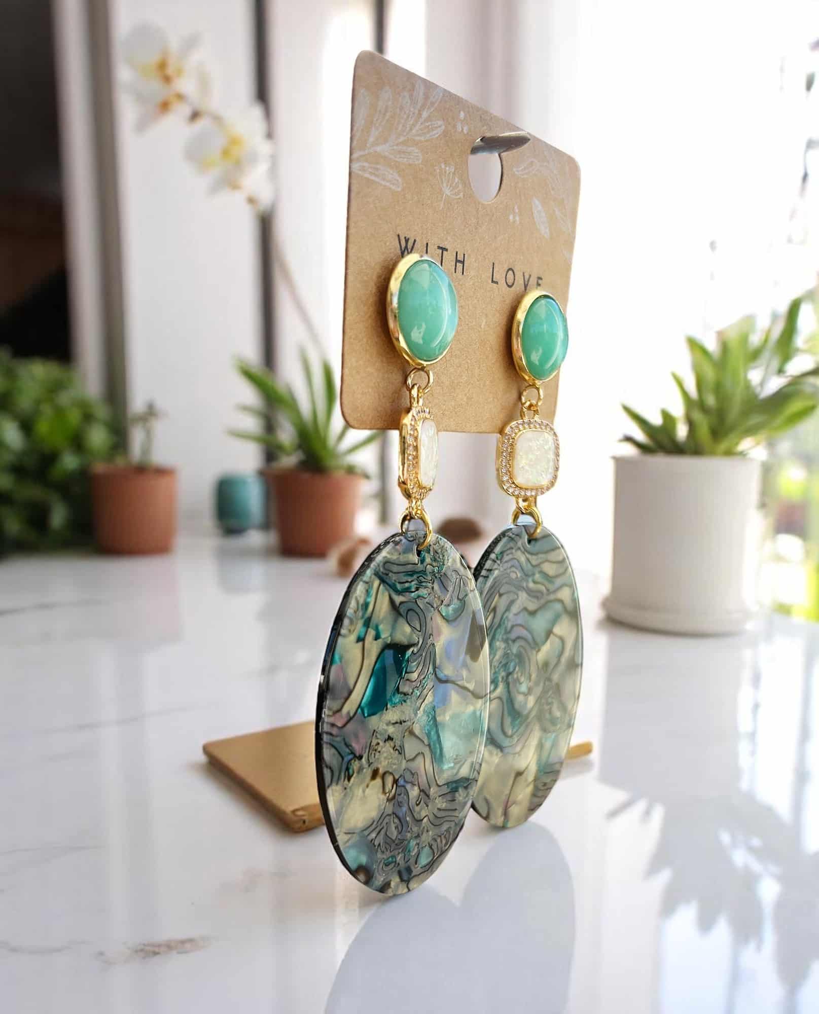 Die Statement Ohrringe DUSTY SEA bestechen durch ihr außergewöhnliches Farbspiel in türkis-blauen Nuancen und ihren edlen Perlmutt-Look. Diese besonderen Ohrringe verleihen Deinem Outfit einen schillernden Akzent und sind ein echtes Highlight für Liebhaberinnen stilvoller Accessoires.