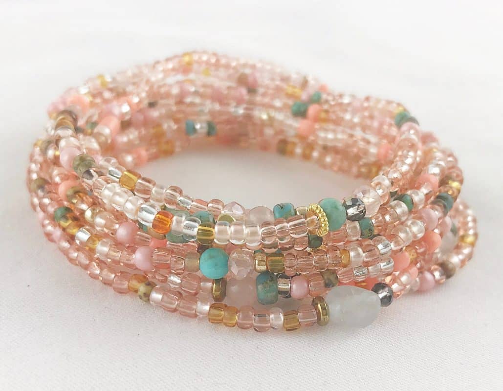 Boho Perlenkette Damen pastell mit Quaste | apricot türkis silber