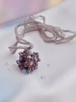 Du erhältst eine handgefertigte Seidenkette SHAMBALLA PURPLE mit helllila Habotai-Seide (max. 95 cm), individuell knotbar, mit einer Kugel aus Miyuki-Perlen, böhmischem Glas, Rivoli-Kristallen und feuervergoldeten Details. Kugeldurchmesser ca. 3,5 cm – ein elegantes Einzelstück, das Stil, Leichtigkeit und Handwerkskunst vereint.