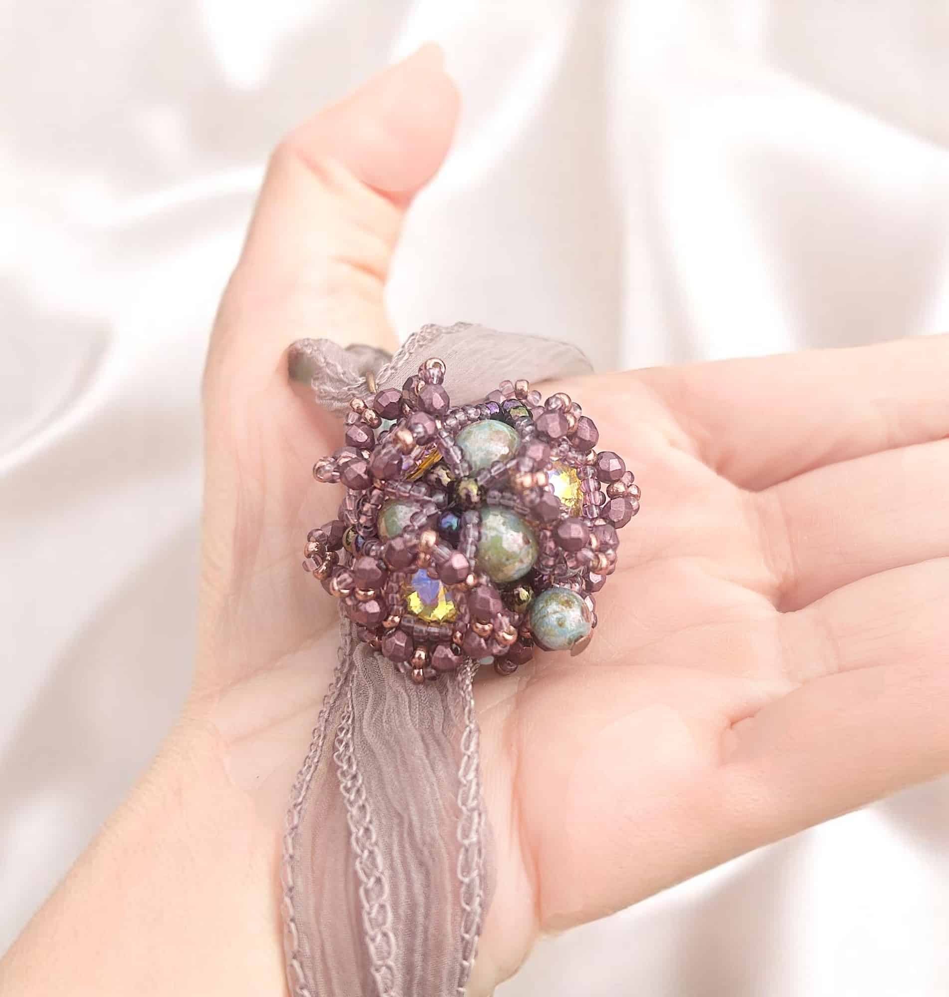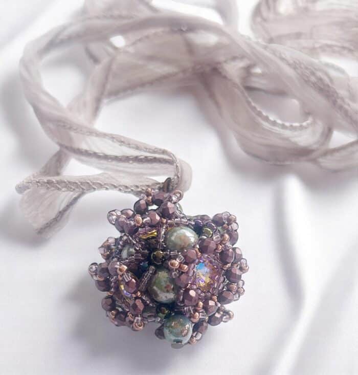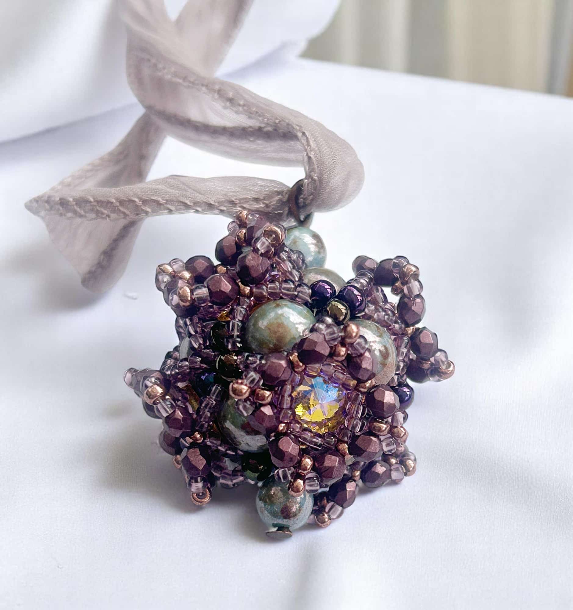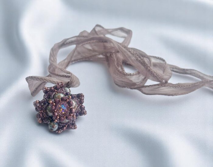 Im Zentrum der Seidenkette steht eine große, kunstvoll gearbeitete Perlenkugel mit einem Durchmesser von ca. 3,5 cm. Diese Kugel ist ein echtes Highlight: Sie besteht aus unzähligen kleinen Miyuki-Perlen, handverlesenem böhmischem Glas, feuervergoldeten Elementen und funkelnden Rivoli-Kristallen. Das Farbspiel aus Violett, Rauchblau und feinen Goldtönen verleiht der Kugel eine lebendige, fast mystische Ausstrahlung. Bei jeder Bewegung reflektiert sie das Licht auf unterschiedliche Weise – ein faszinierender Effekt, der die Perlenkette SHAMBALLA zum absoluten Hingucker macht.